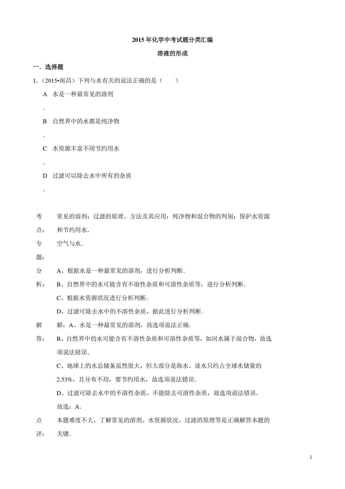 一、2015年化学中考试题分类汇编:溶液的形成(含答案)