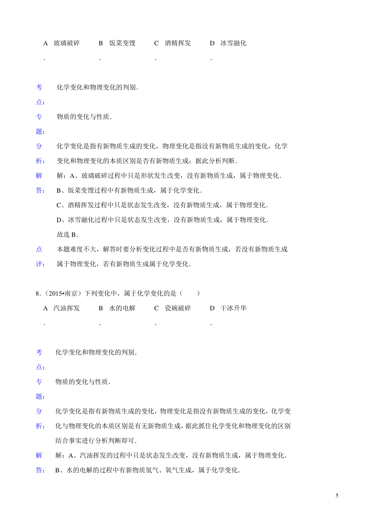 一、2015年化学中考试题分类汇编:物质的物理变化和化学变化(含答案)