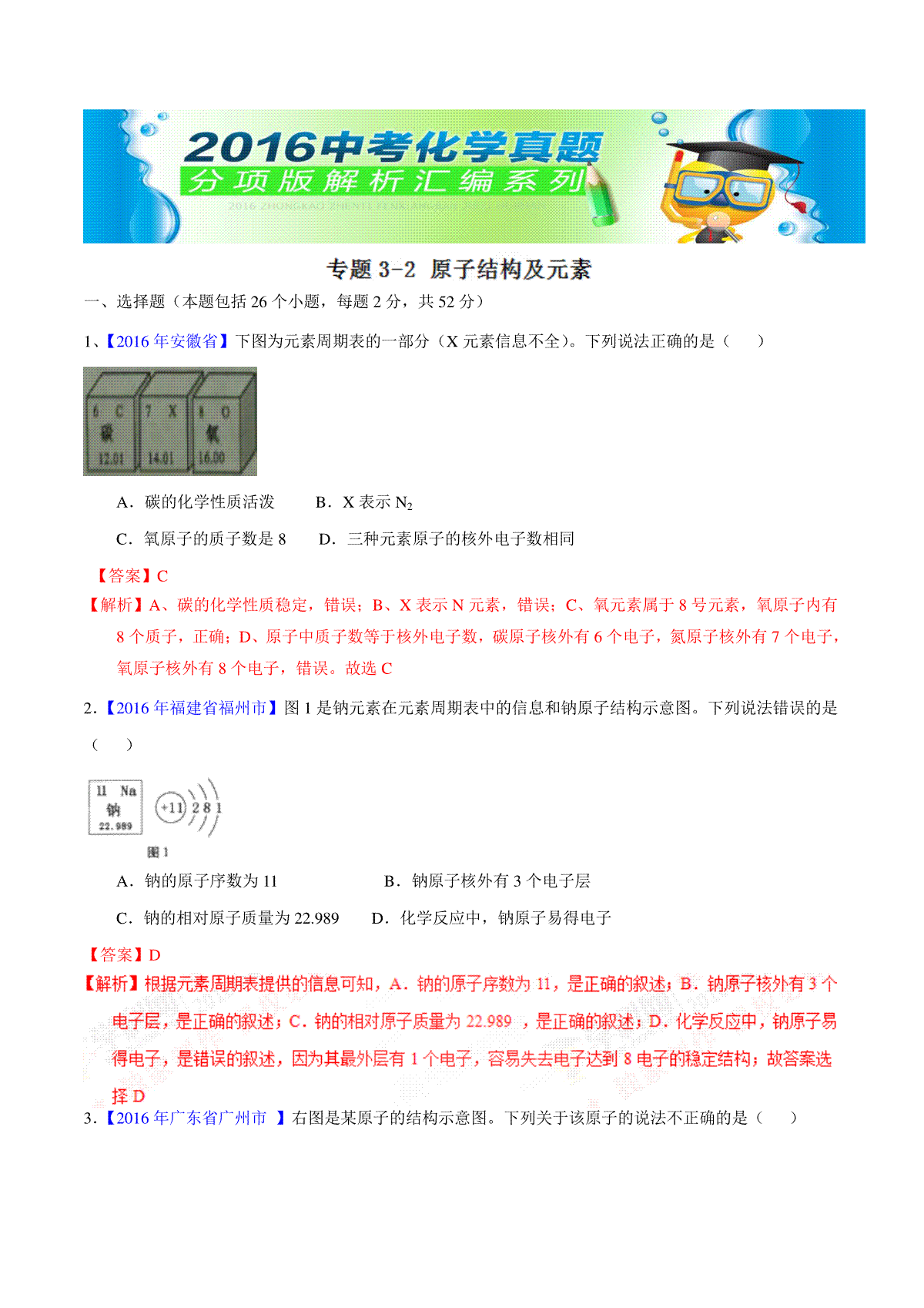 专题3.2 原子结构及元素(第01期)-2016年中考化学试题分项版解析汇编(解析版)于近期开考,本次考试对考生对知识的掌握参考价值大,为了方便大家复习掌握错题!小编在下文为大家准备了专题3.2 原子结构及元素(第01期)-2016年中考化学试题分项版解析汇编(解析版)试卷及答案解析详情,仅供考生参考。