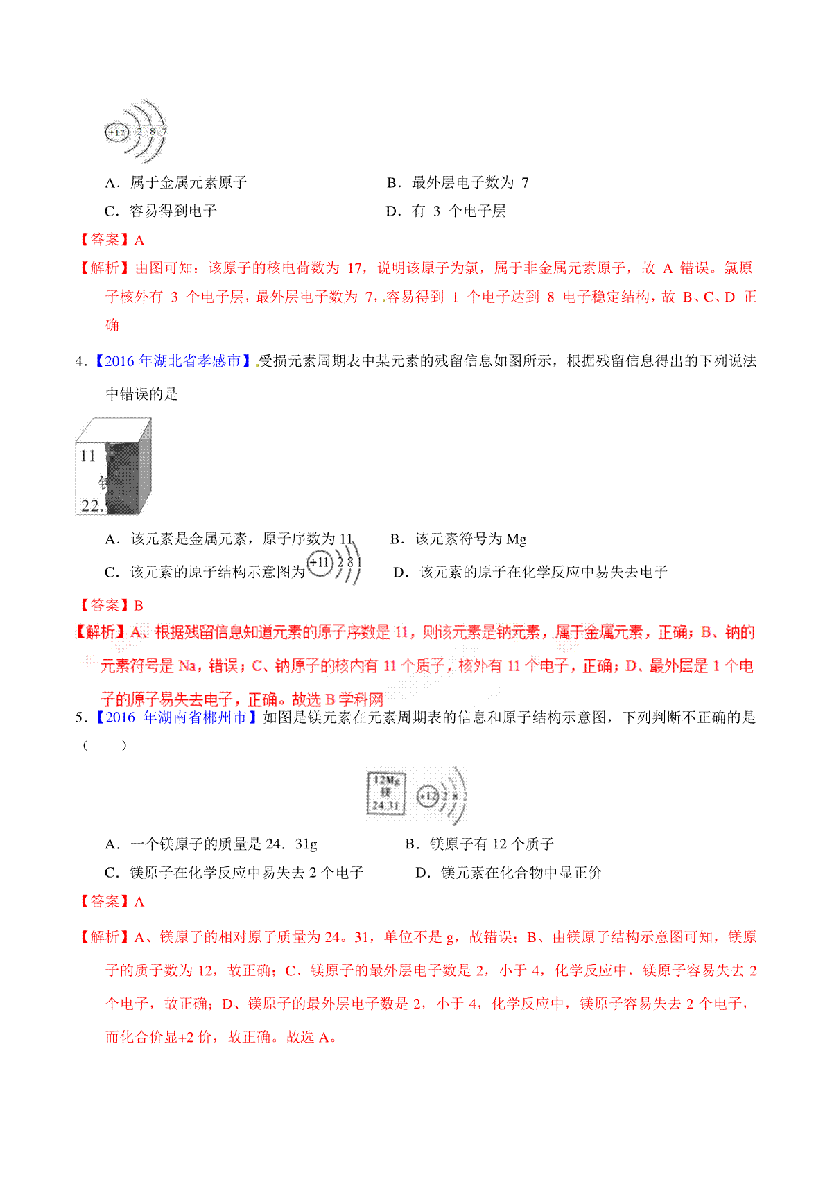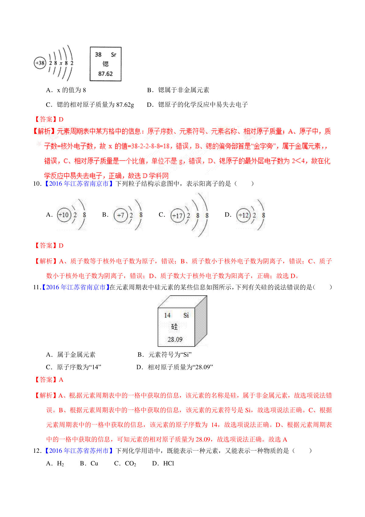一、专题3.2 原子结构及元素(第01期)-2016年中考化学试题分项版解析汇编(解析版)