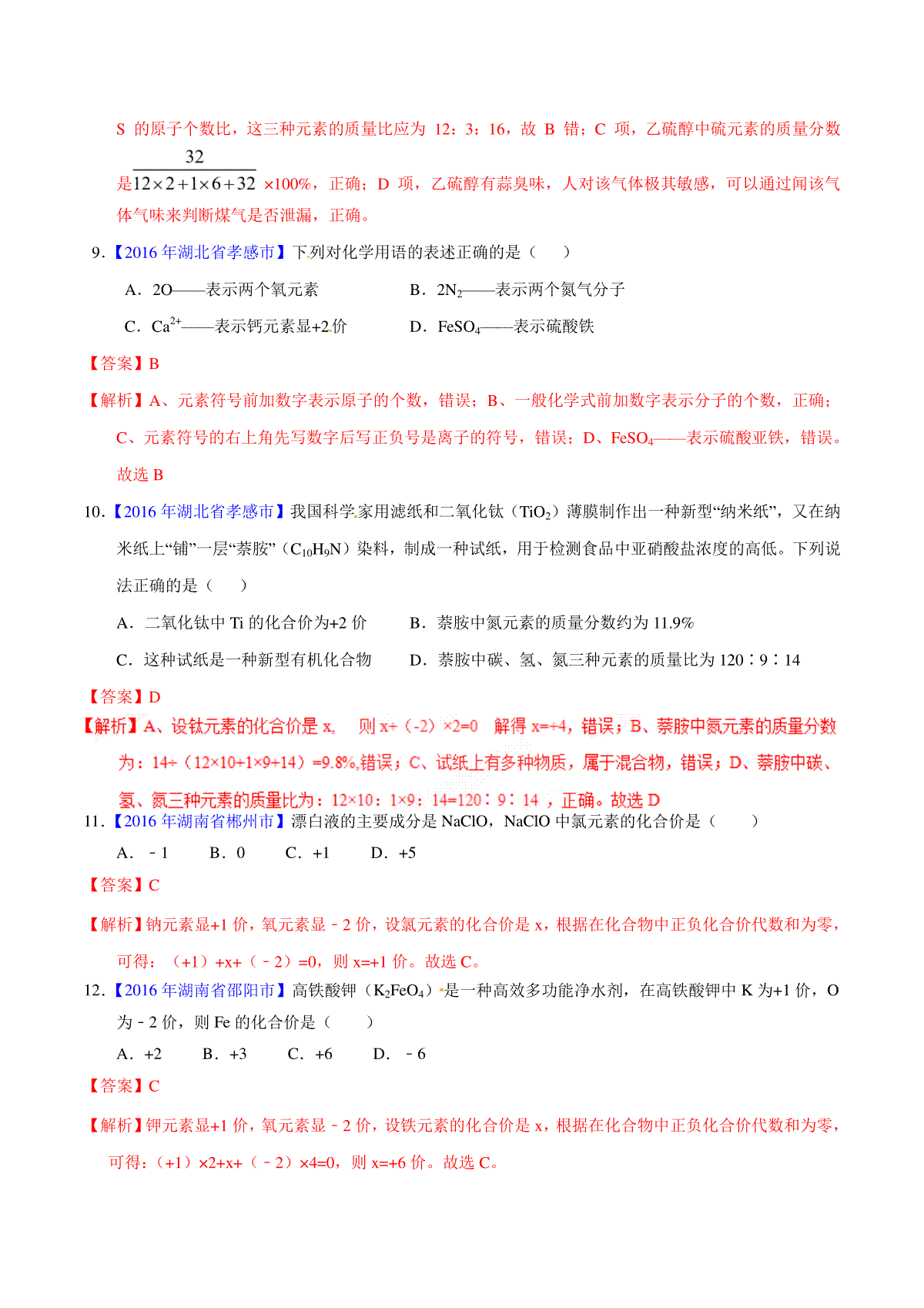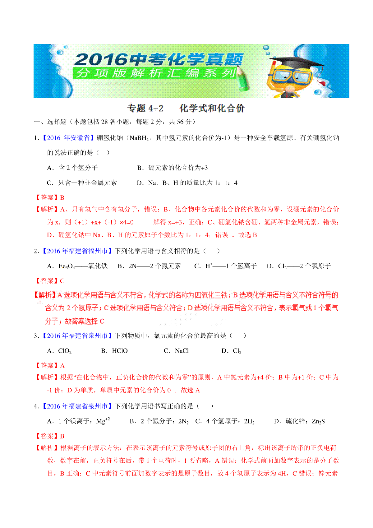 一、专题4.2 化学式和化合价(第01期)-2016年中考化学试题分项版解析汇编(解析版)