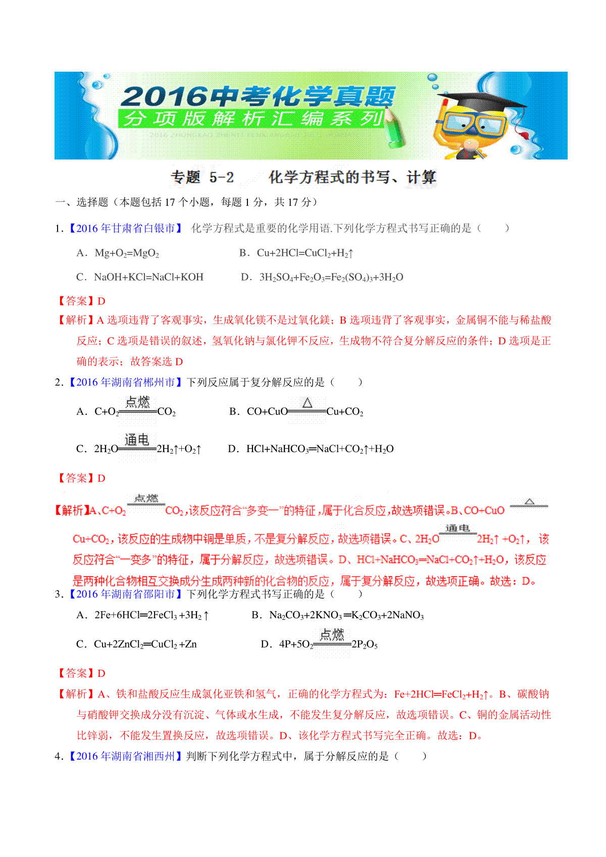 一、专题5.2 化学方程式的书写、计算(第01期)-2016年中考化学试题分项版解析汇编(解析版)