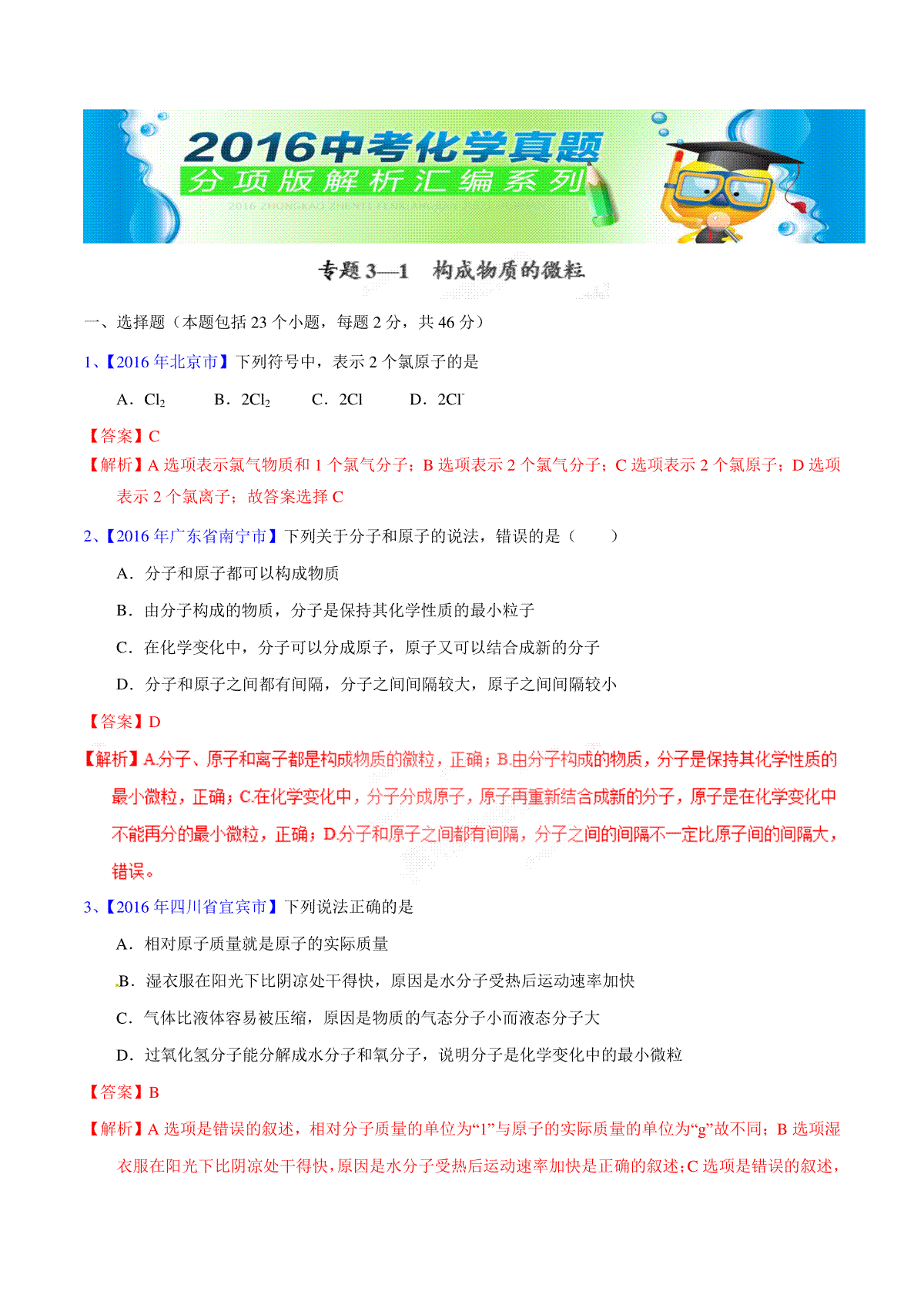 一、专题3.1 构成物质的微粒(第02期)-2016年中考化学试题分项版解析汇编(解析版)