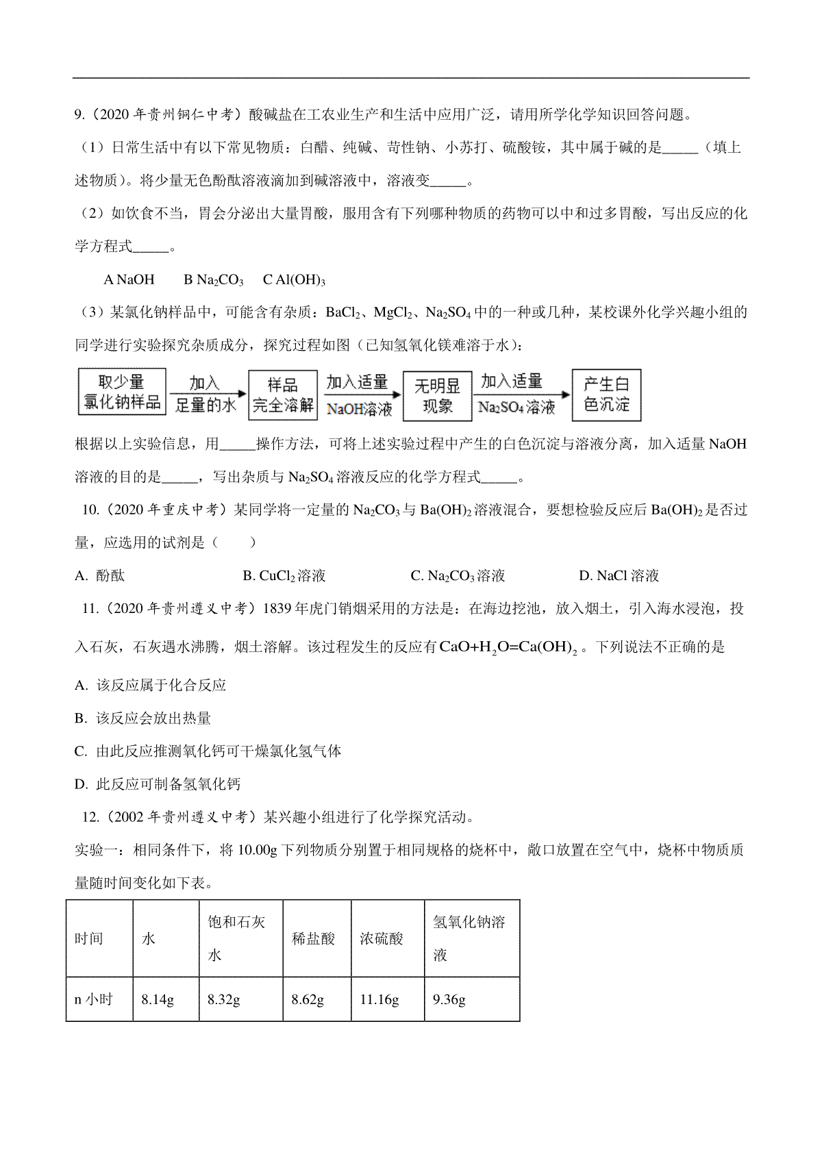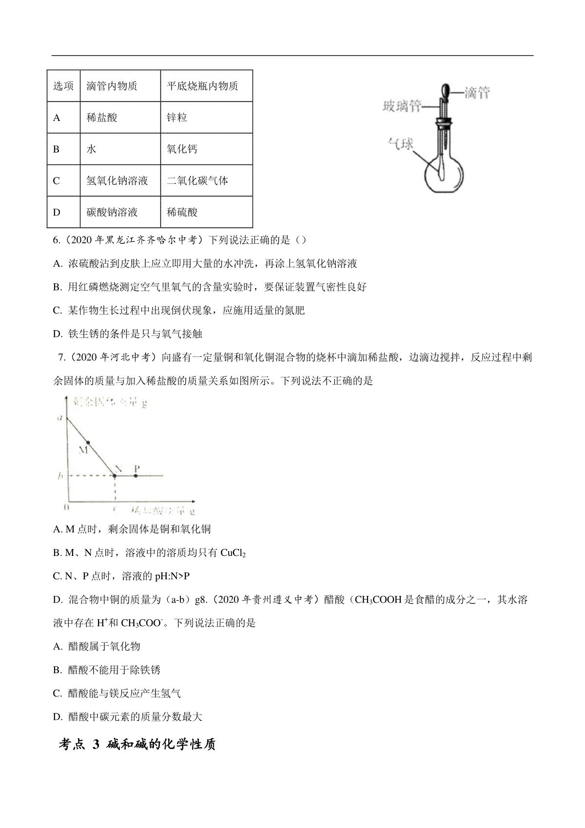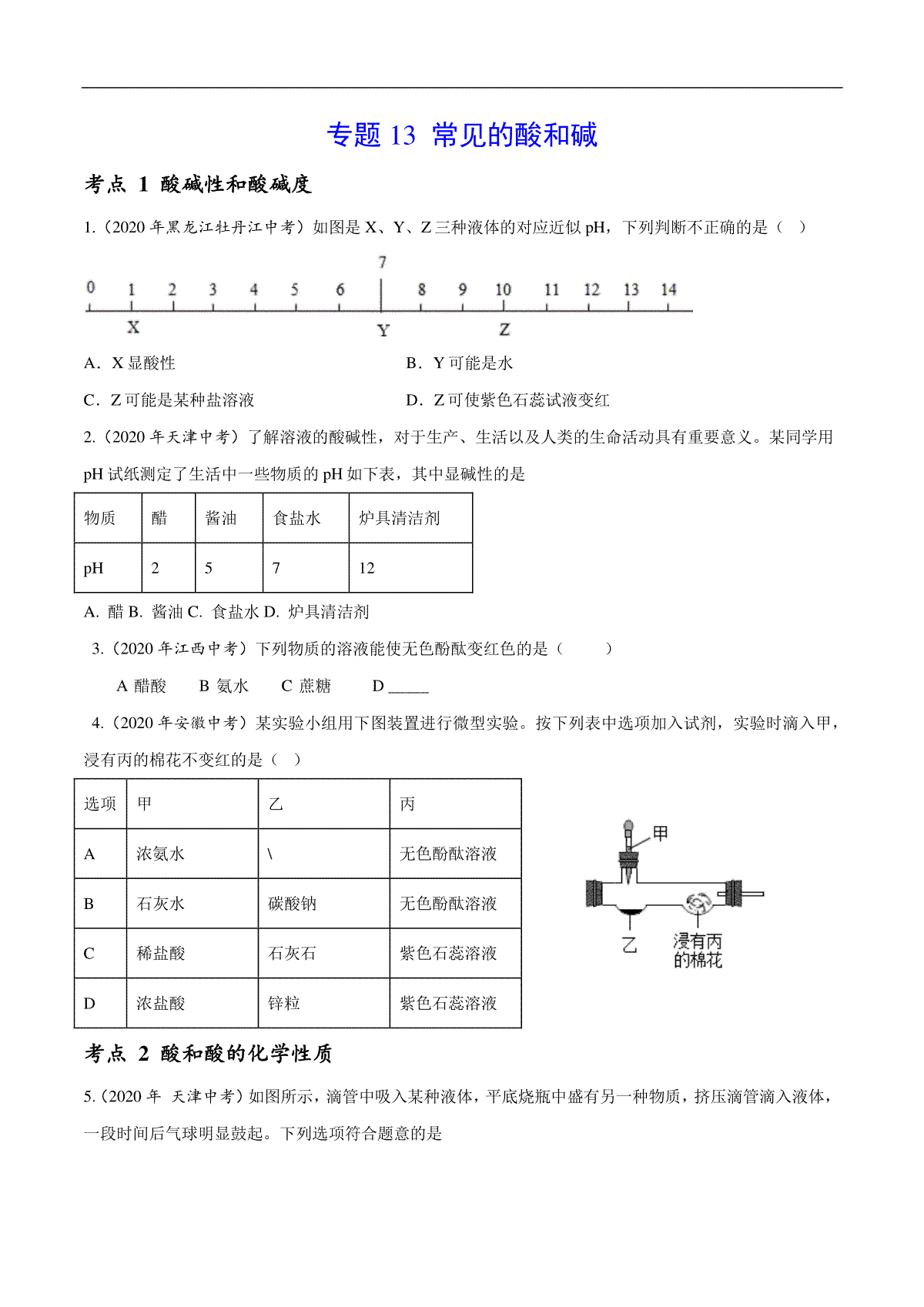 1.专题13 常见的酸和碱-2020年中考真题化学分项汇编(原卷版)