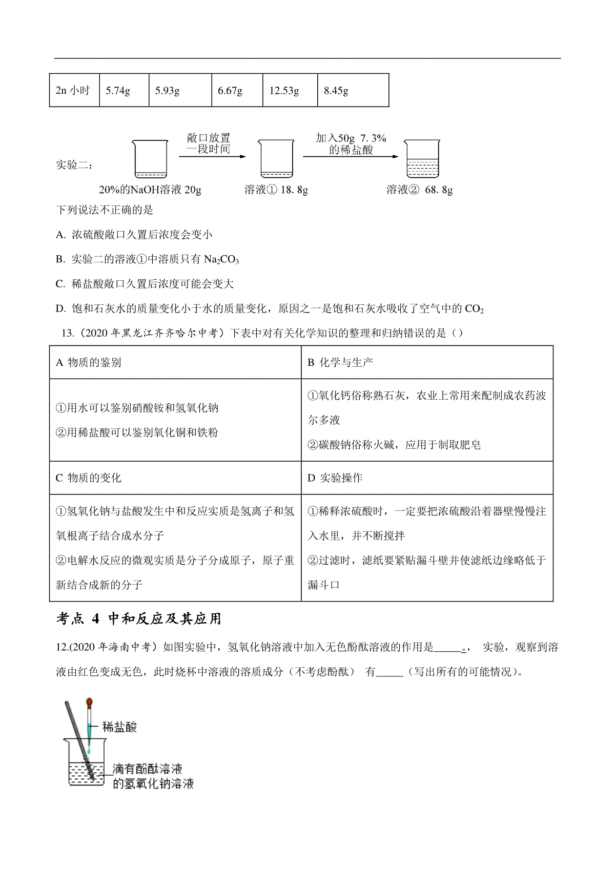 一、专题13 常见的酸和碱-2020年中考真题化学分项汇编(原卷版)
