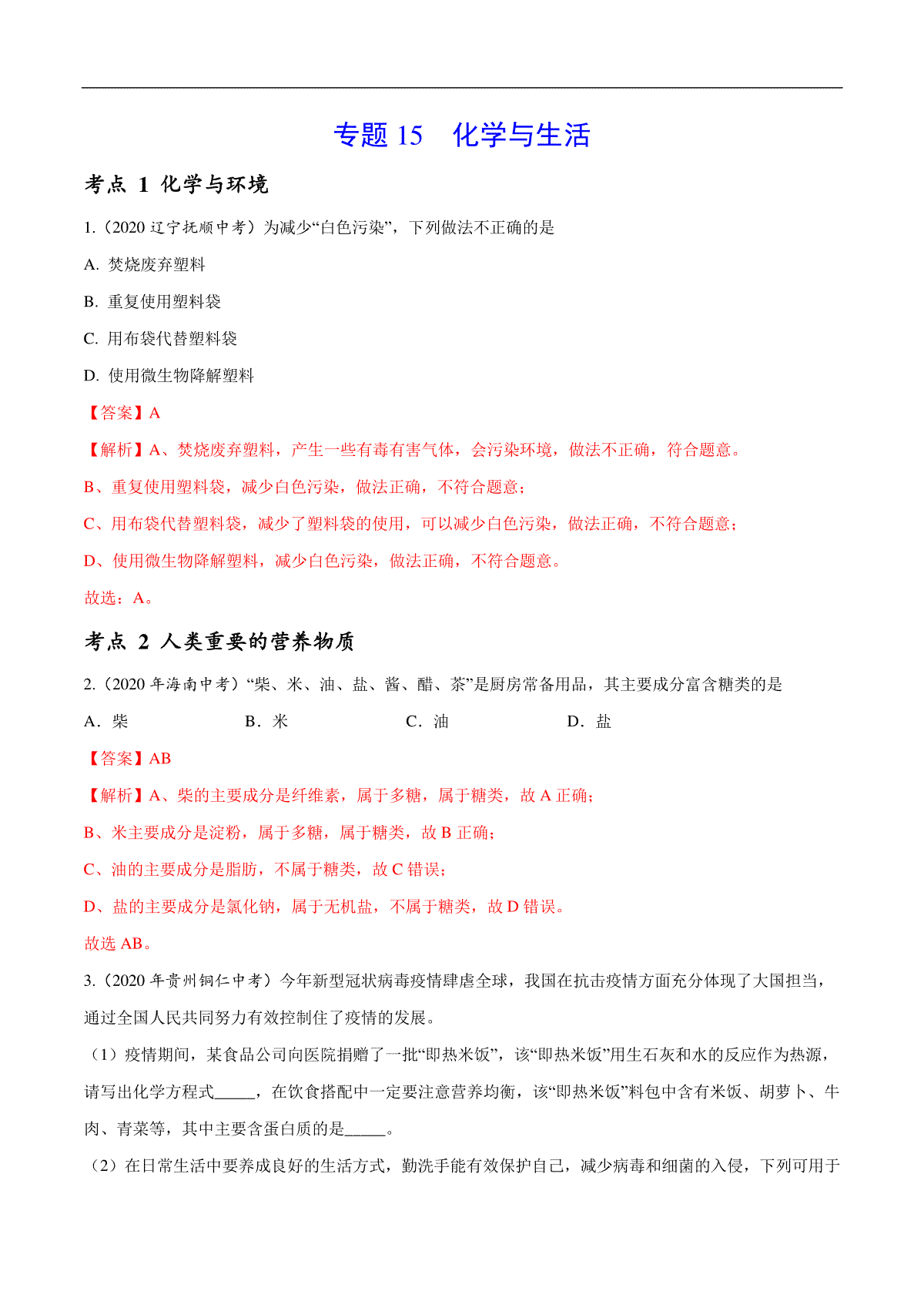 1.专题15 化学与生活-2020年中考真题化学分项汇编(解析版)