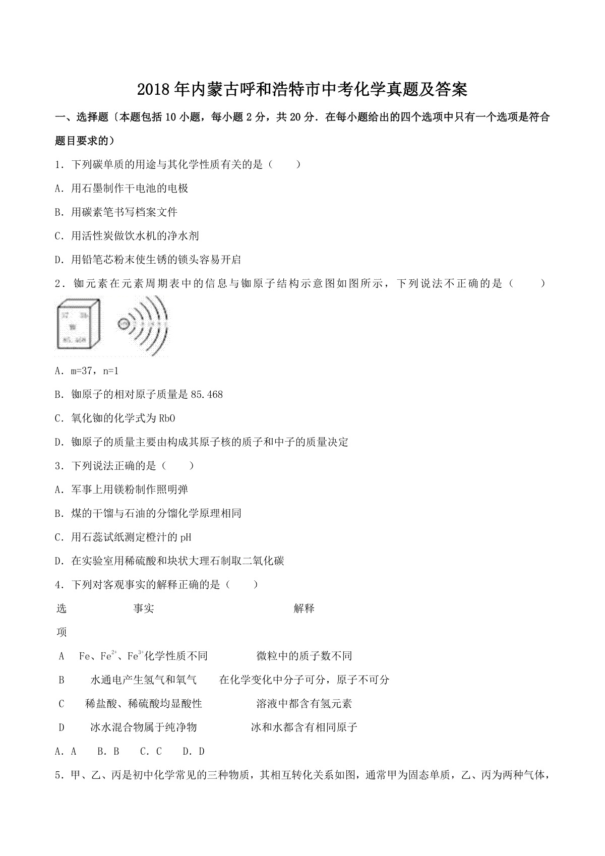 一、2018年内蒙古呼和浩特市中考化学真题及答案