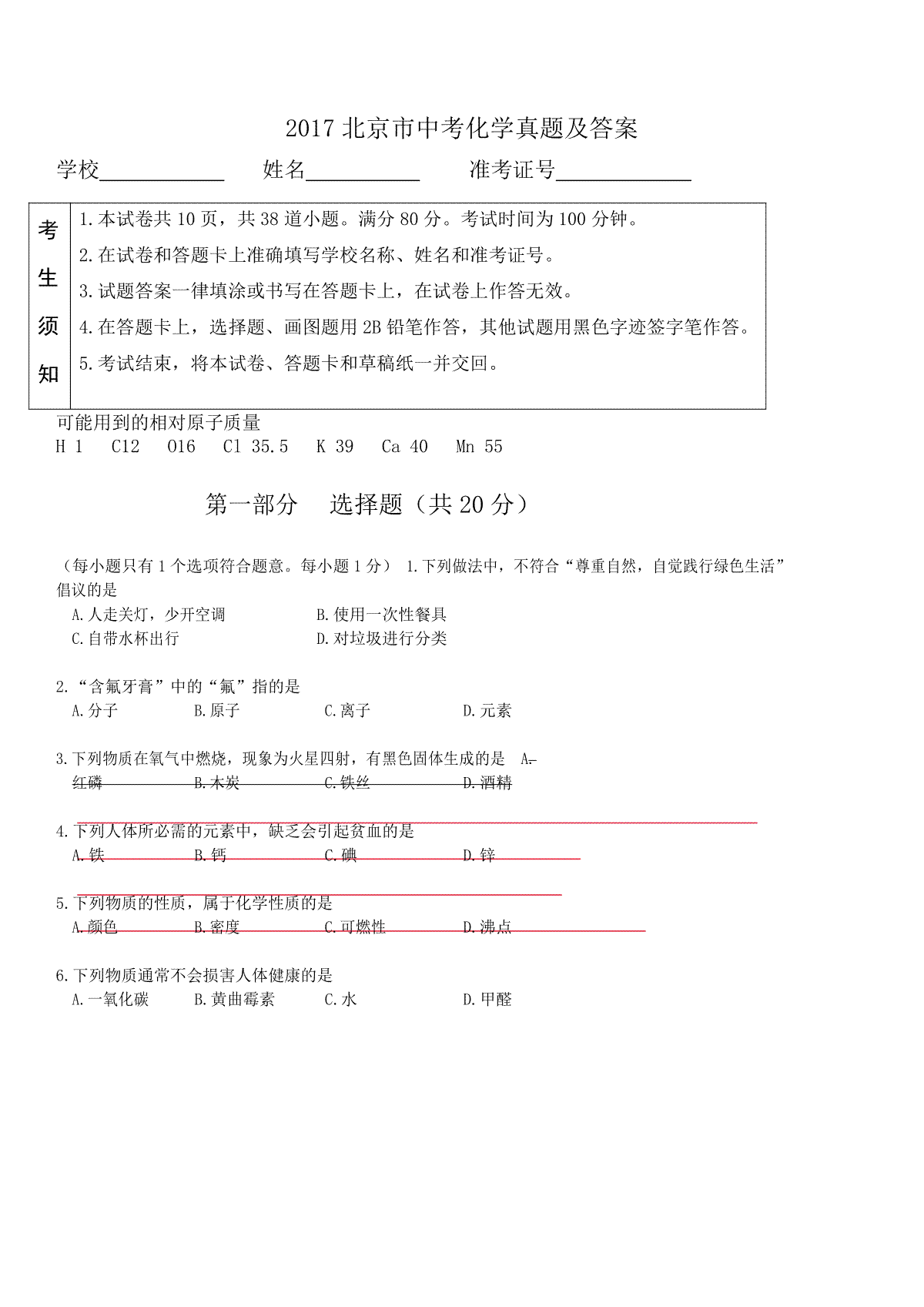 下载2017北京市中考化学真题及答案PDF格式或doc