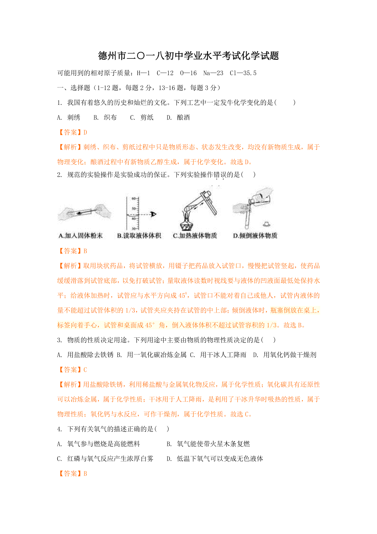 一、2018年德州市中考化学试卷及答案解析