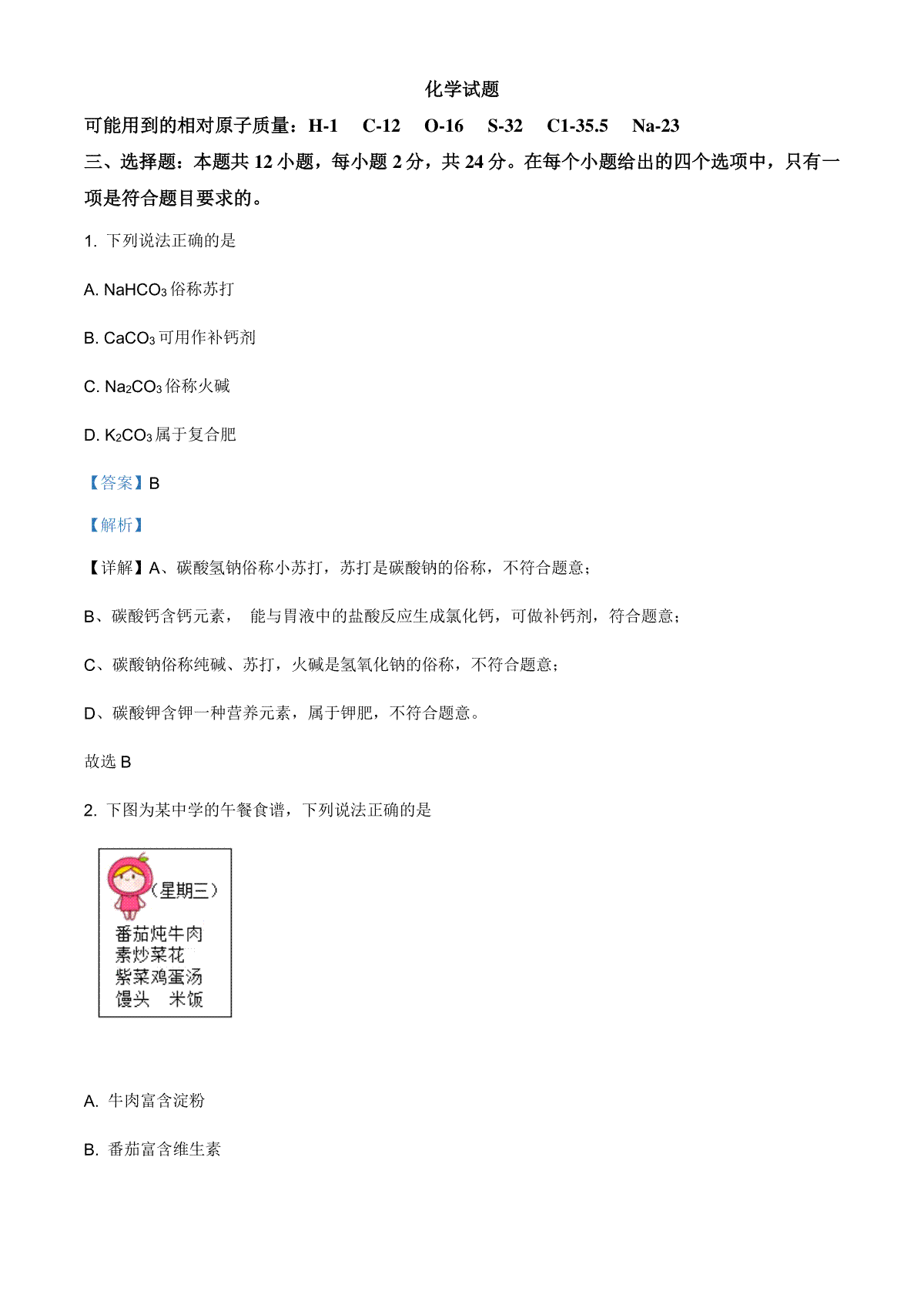 2.精品解析:湖北省黄石市2020年中考化学试题(原卷版)
