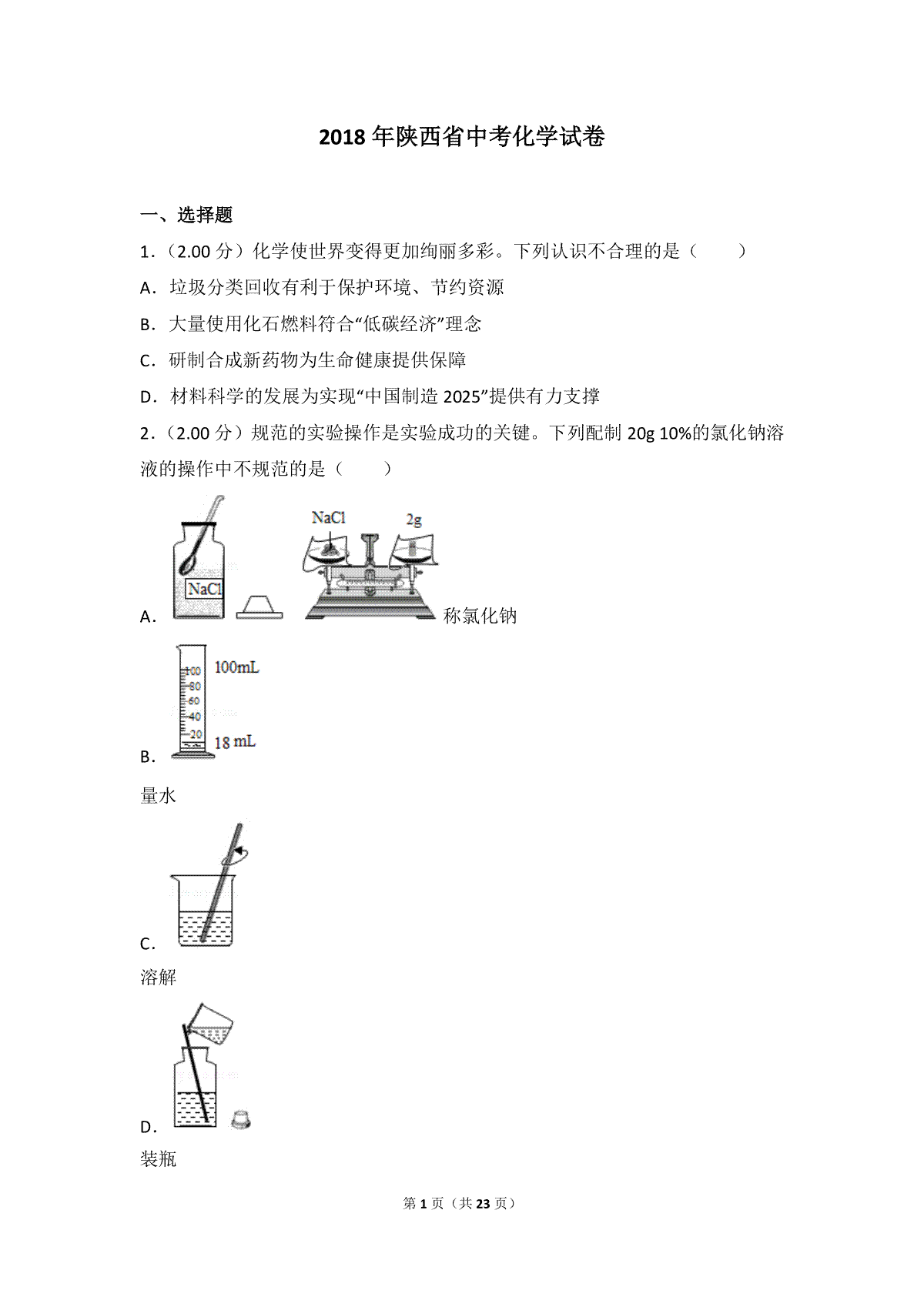 下载陕西省2018年中考化学试题(含答案)PDF格式或doc