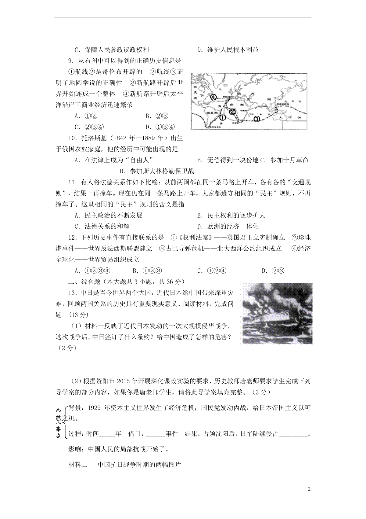 2.四川省自贡市2015年中考历史真题试题(含答案)