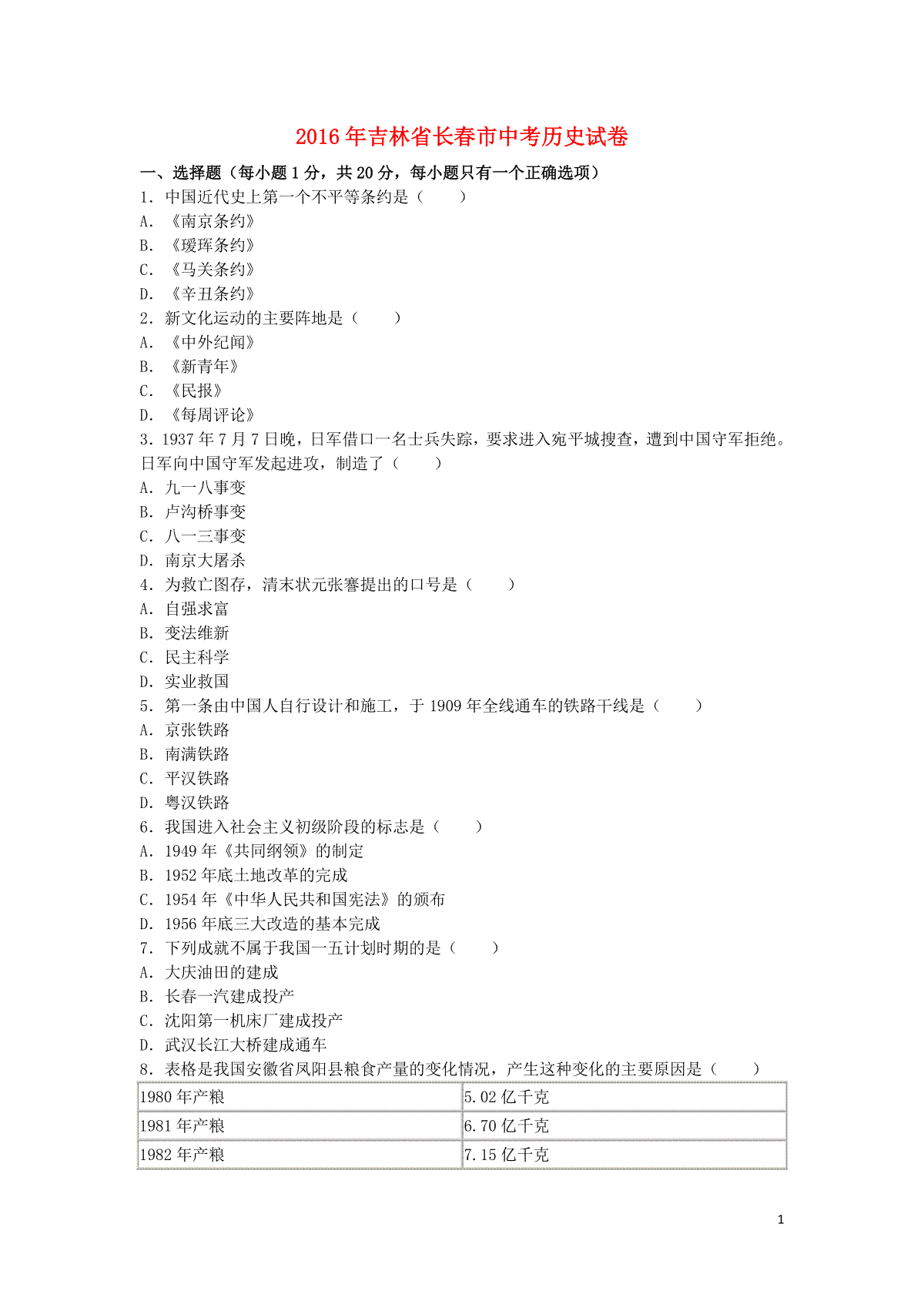 一、吉林省长春市2016年中考历史真题试题(含解析)