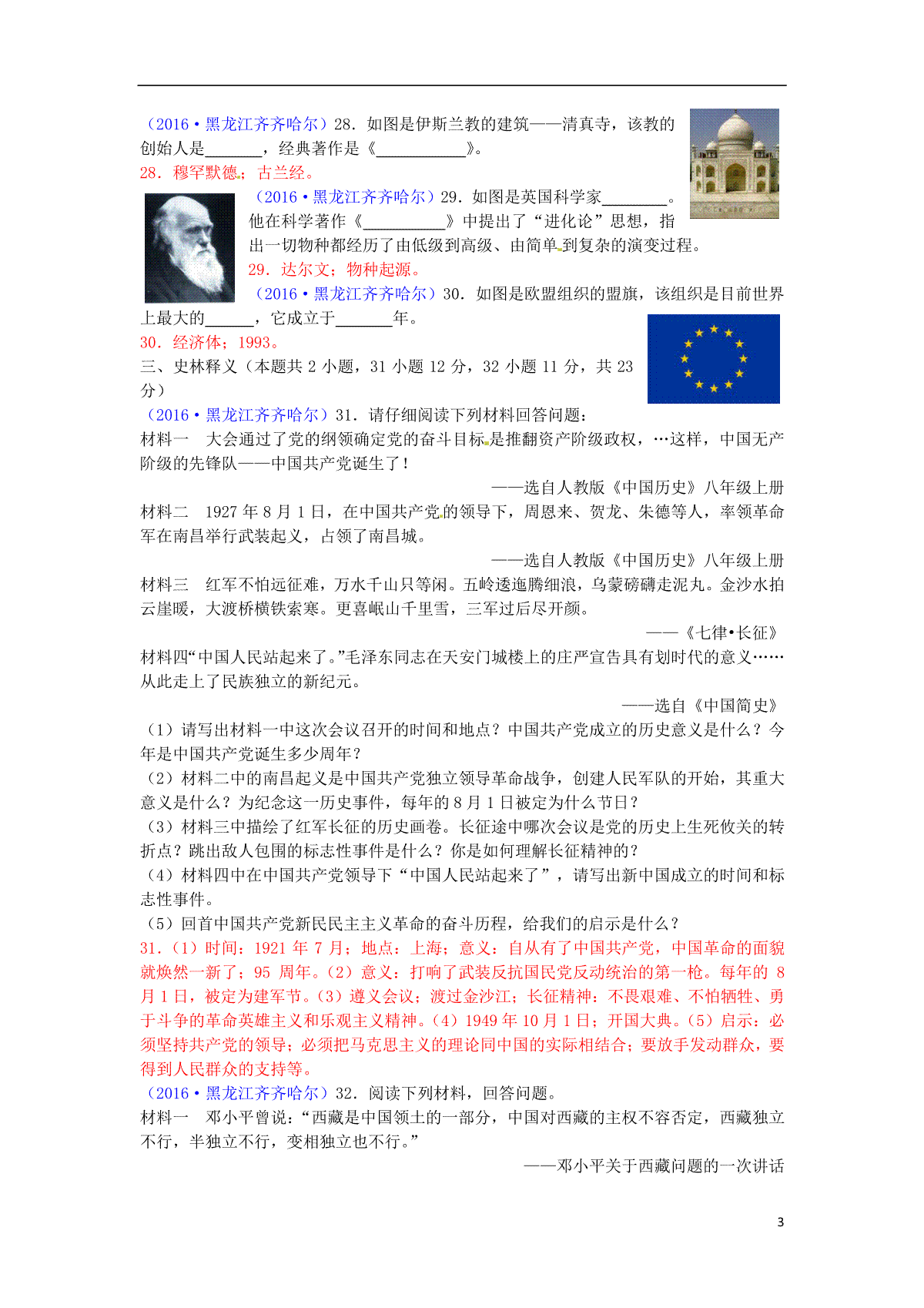 1.黑龙江省齐齐哈尔市2016年中考历史真题试题(含答案)