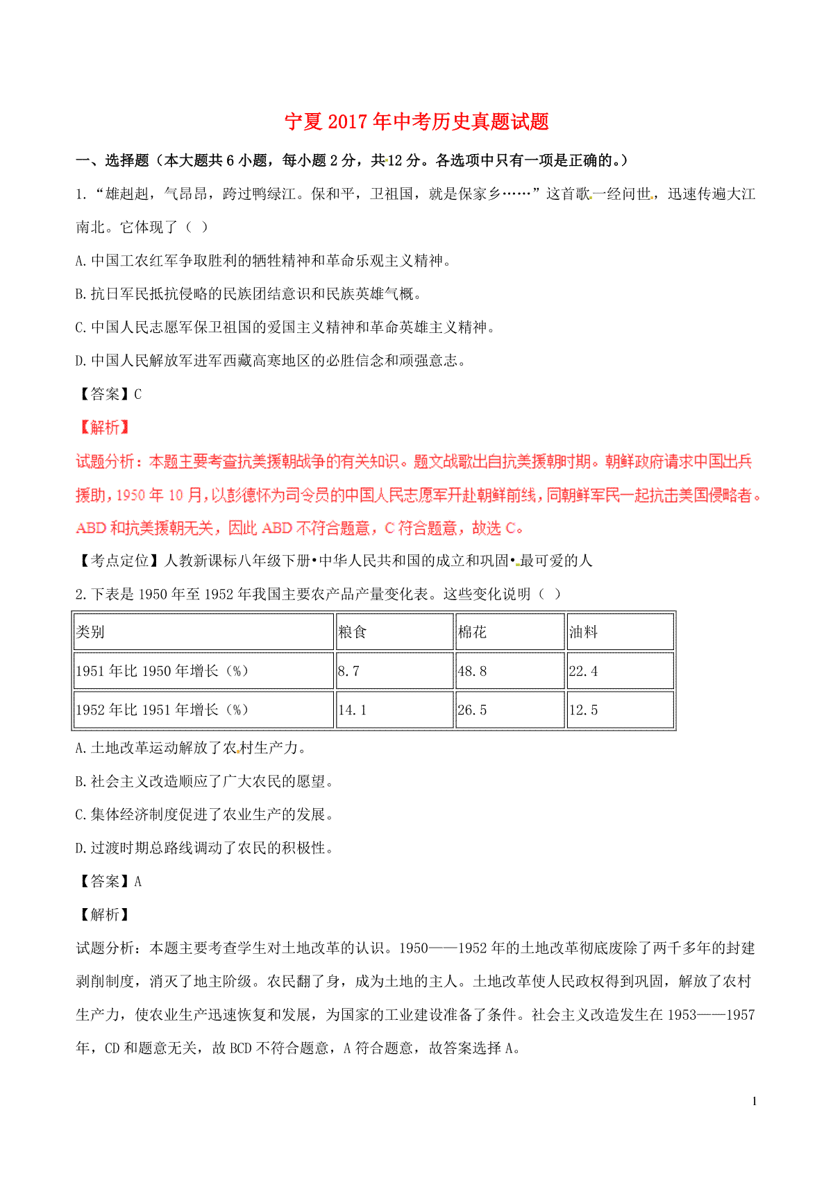 1.宁夏2017年中考历史真题试题(含解析)