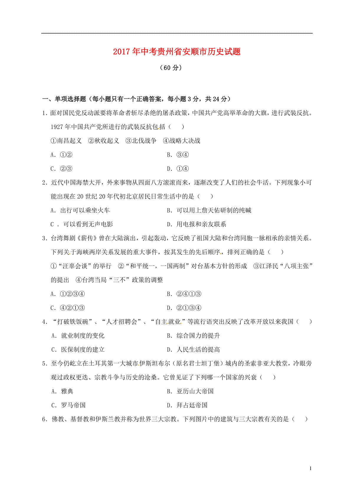 一、贵州省安顺市2017年中考历史真题试题(含答案)