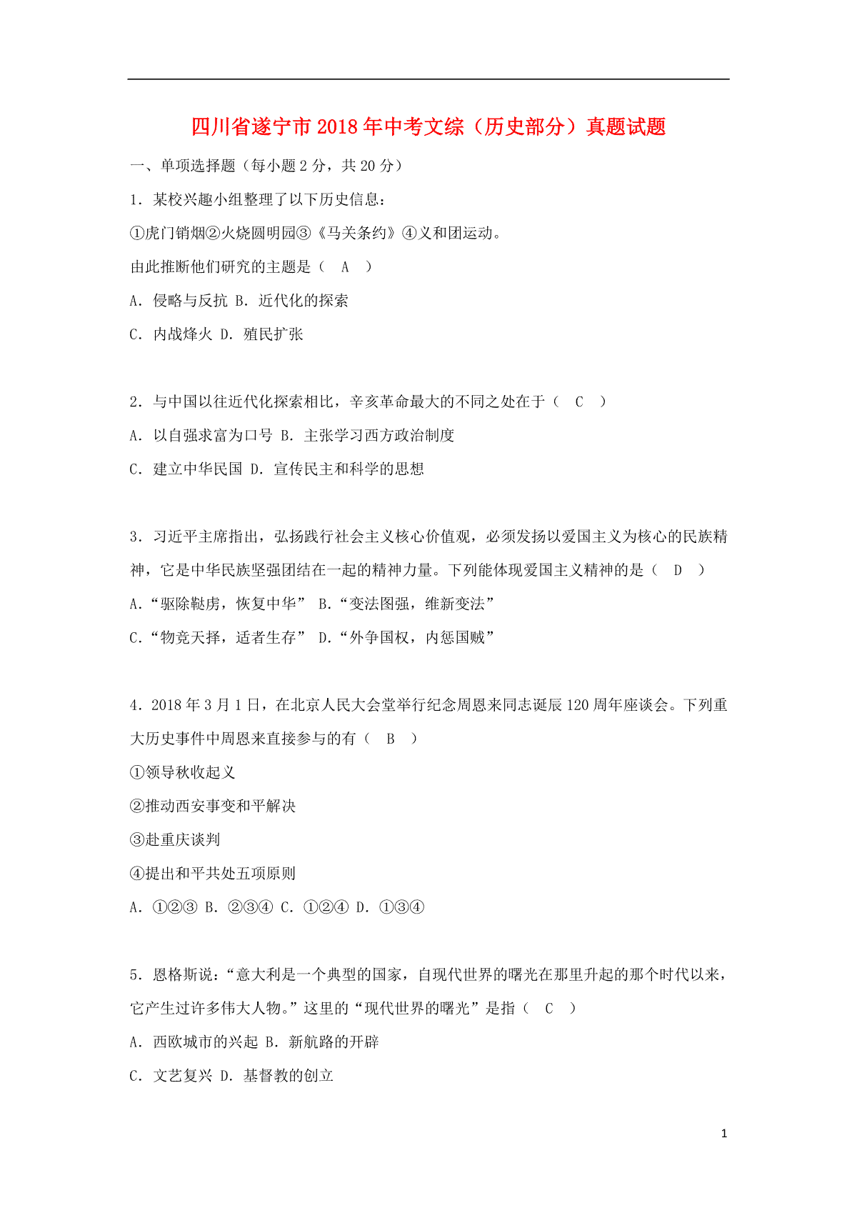 1.四川省遂宁市2018年中考文综(历史部分)真题试题(含答案)