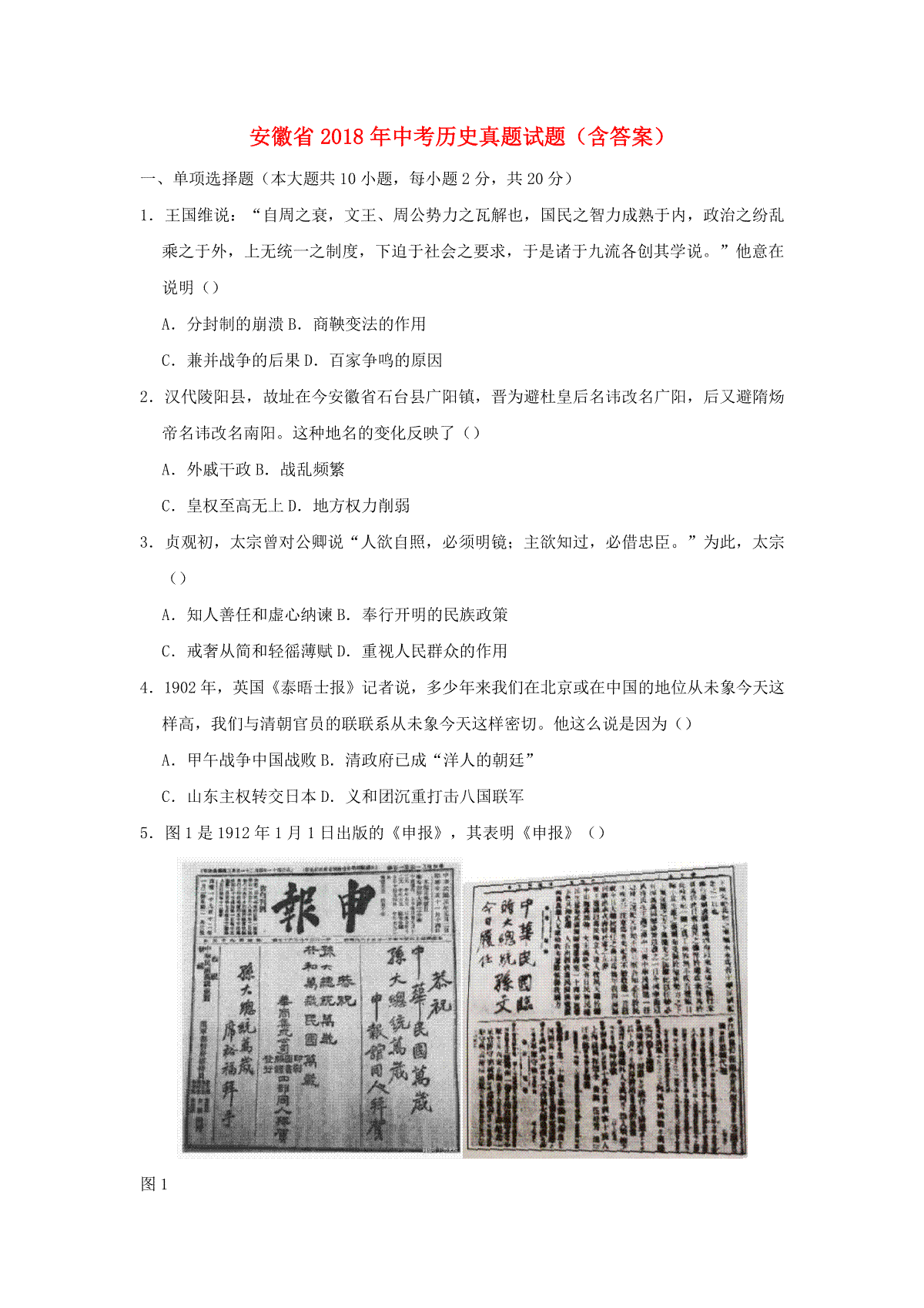 1.安徽省2018年中考历史真题试题(含答案)