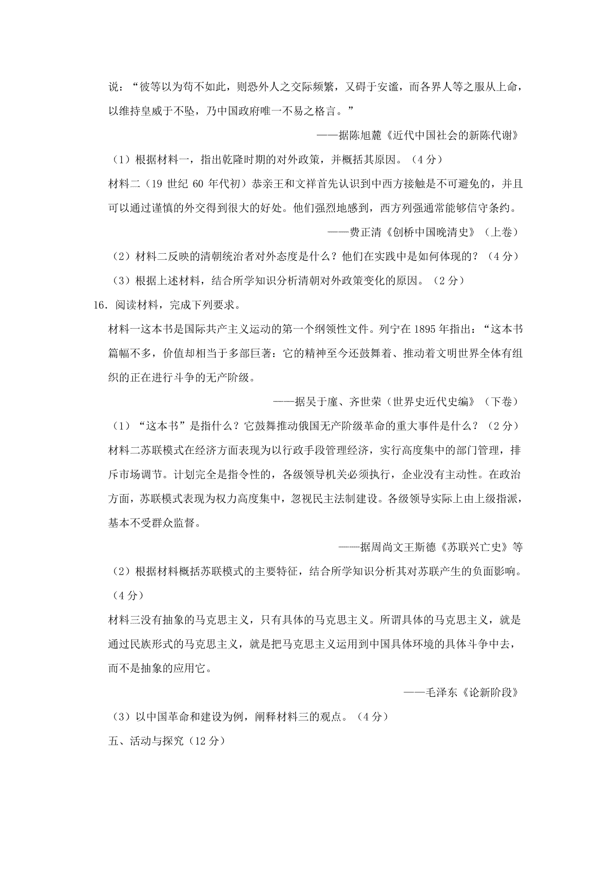 四川省南充市2016年中考文综(历史部分)真题试题(含答案)