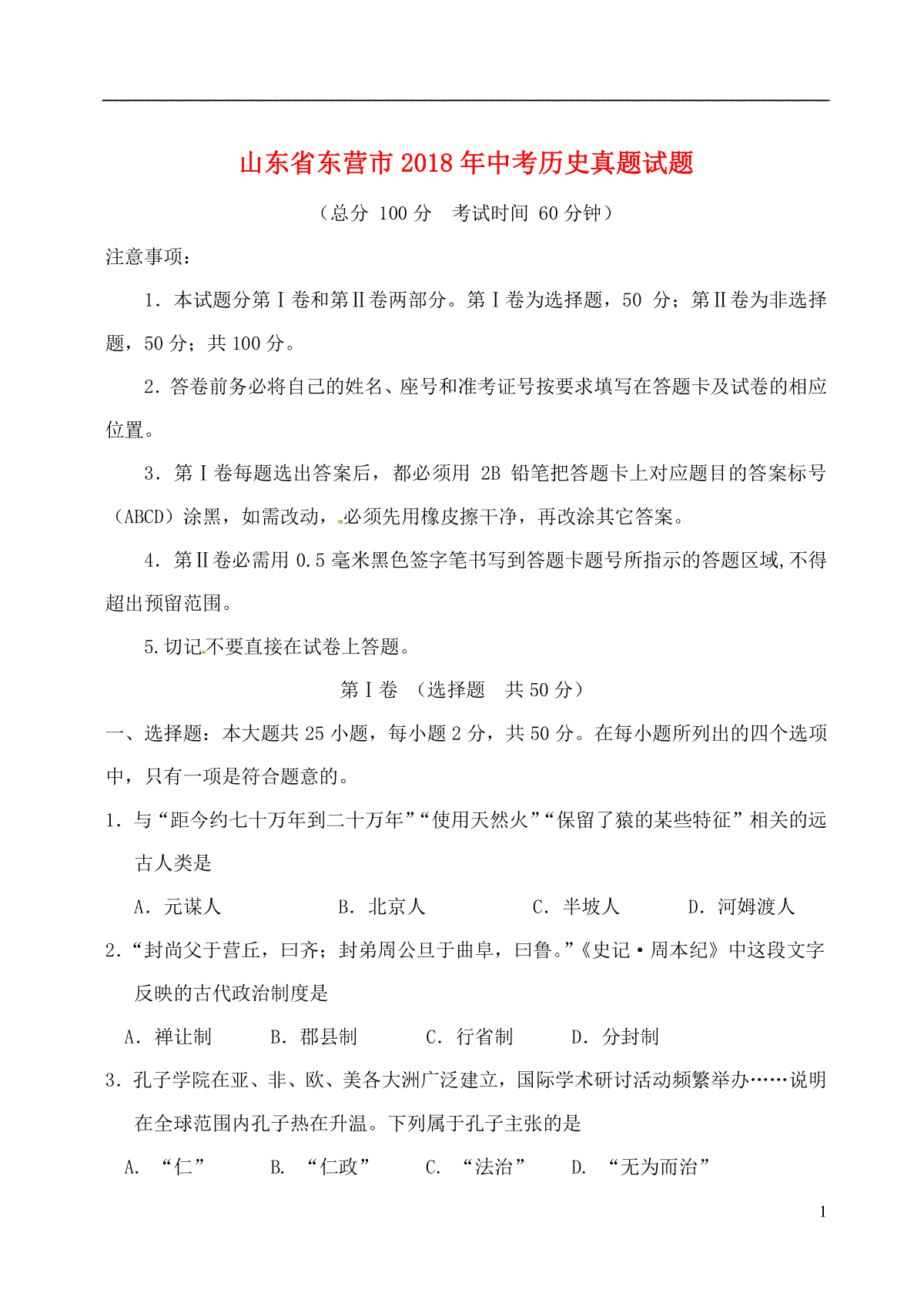 1.山东省东营市2018年中考历史真题试题(含答案)