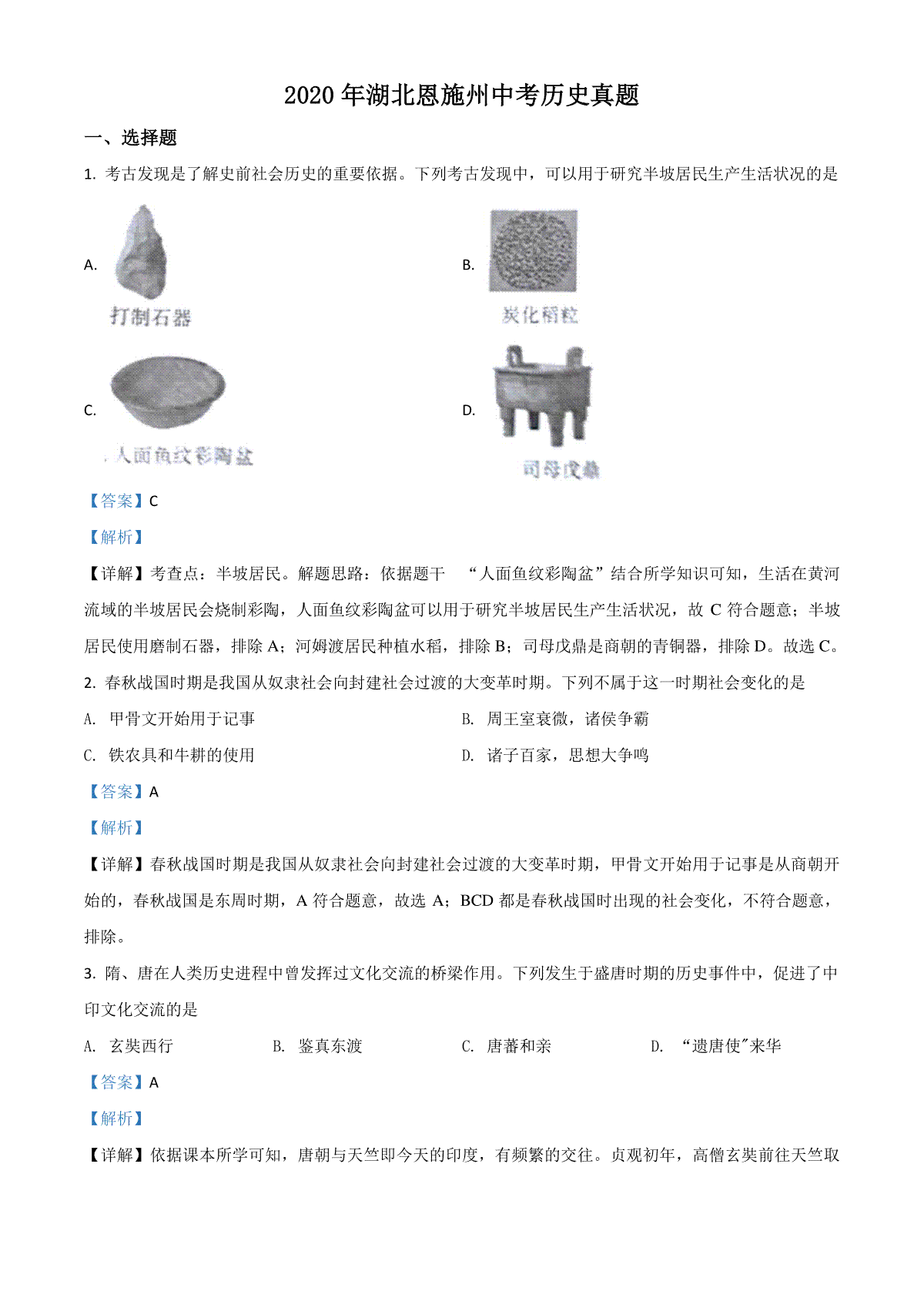 一、精品解析:湖北省恩施州2020年中考历史试题(解析版)