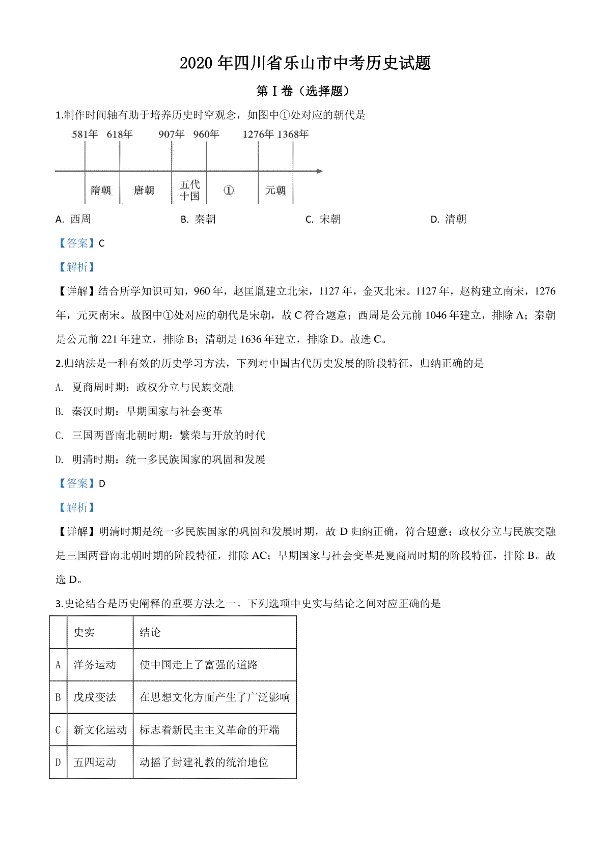 一、精品解析:四川省乐山市2020年中考历史试题(解析版)