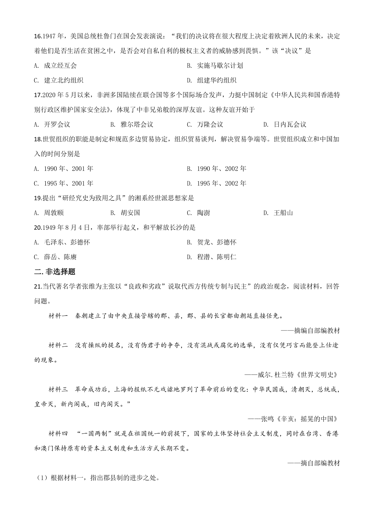 如果你想下载精品解析:湖南省岳阳市2020年中考历史试题(原卷版)DOC或PDF版,请点击本文末链接!