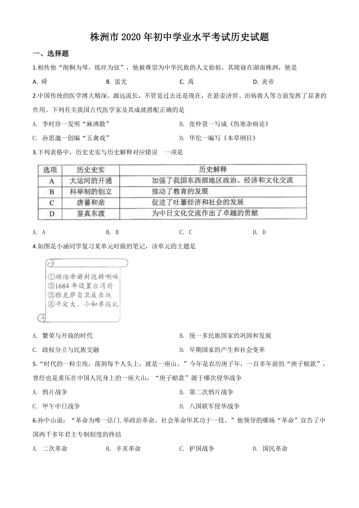 1.精品解析:湖南省株洲市2020年中考历史试题(原卷版)