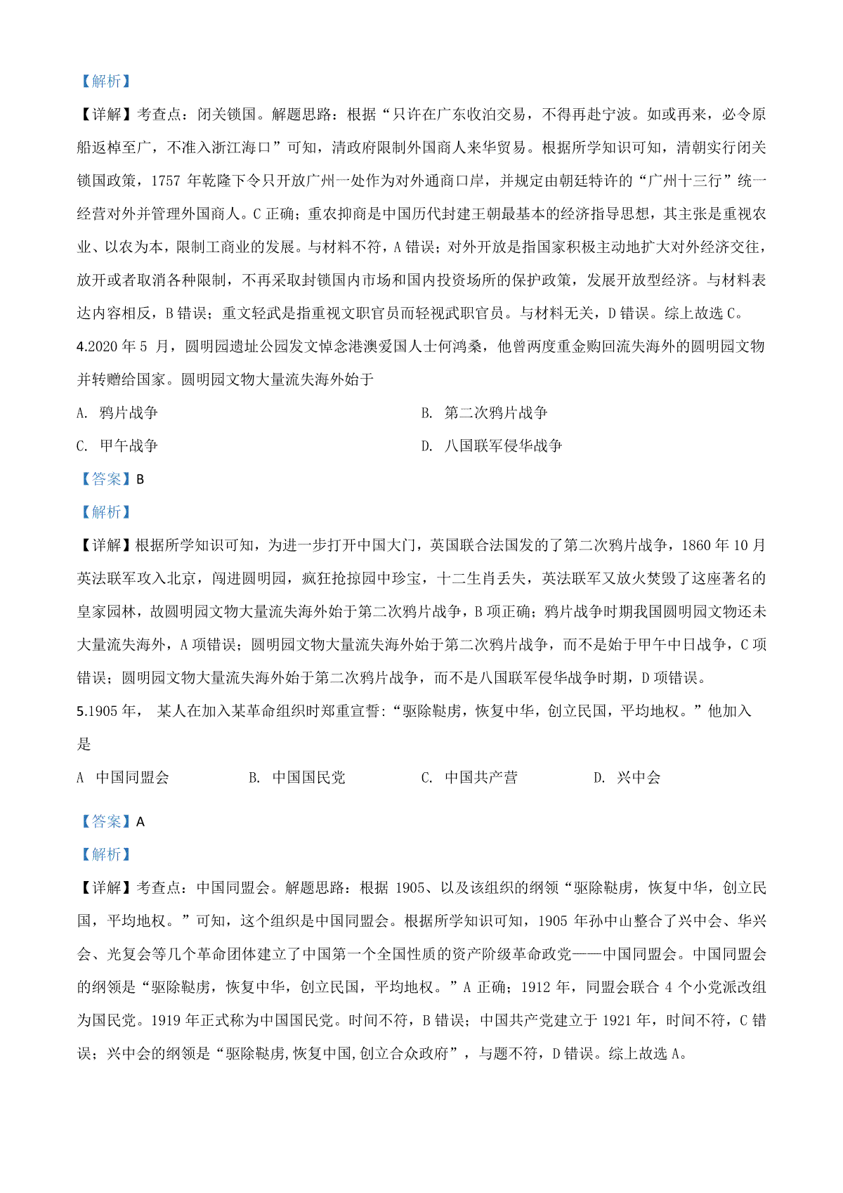 3.精品解析:湖南省永州市2020年中考历史试题(解析版)