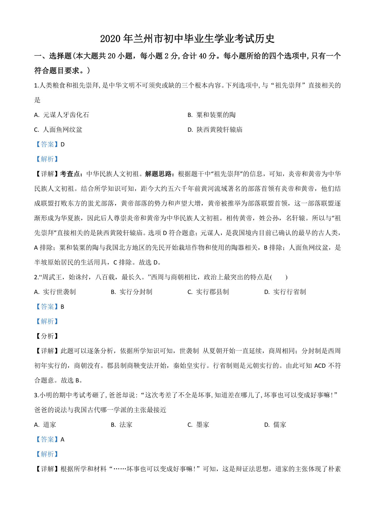 一、精品解析:甘肃省兰州市2020年中考历史试题(解析版)