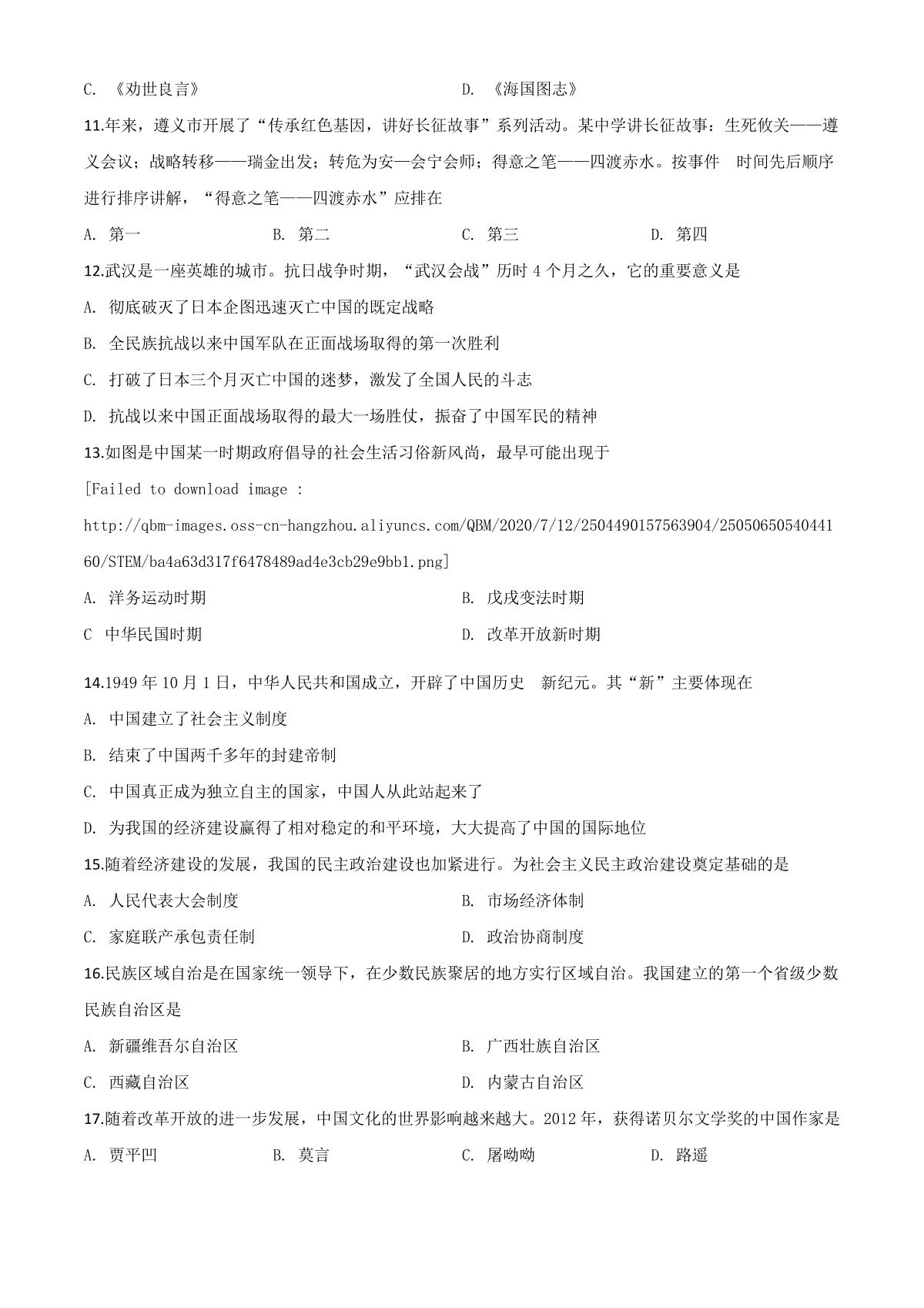 一、精品解析:贵州省遵义市2020年中考历史试题(原卷版)