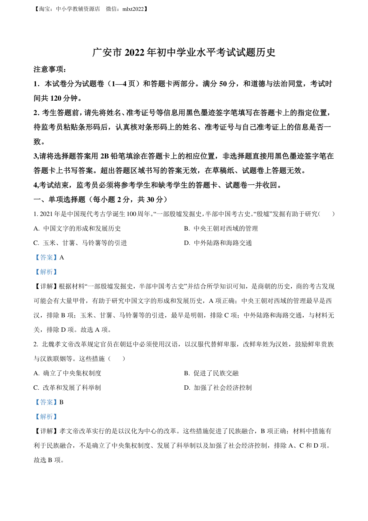 一、精品解析:2022年四川省广安市中考历史真题(解析版)