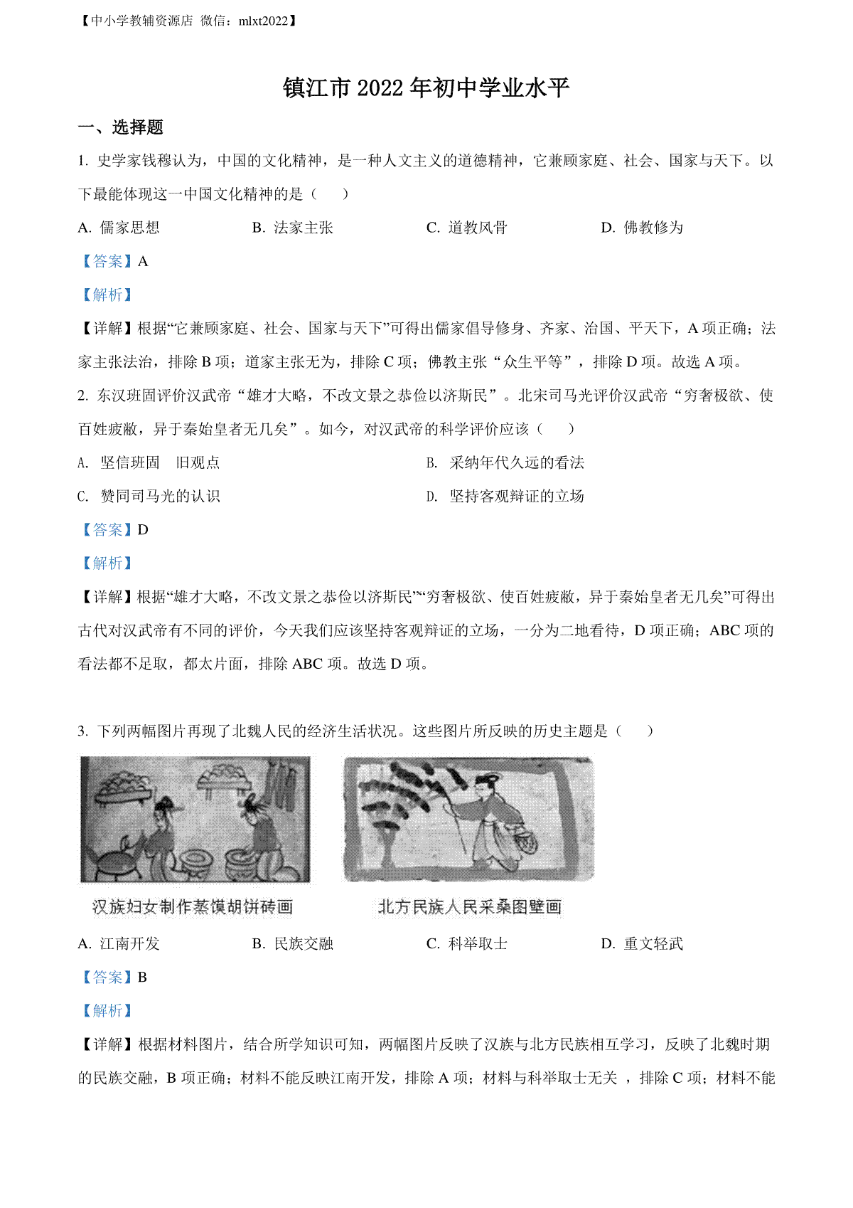 一、精品解析:2022年江苏省镇江市中考历史真题(解析版)
