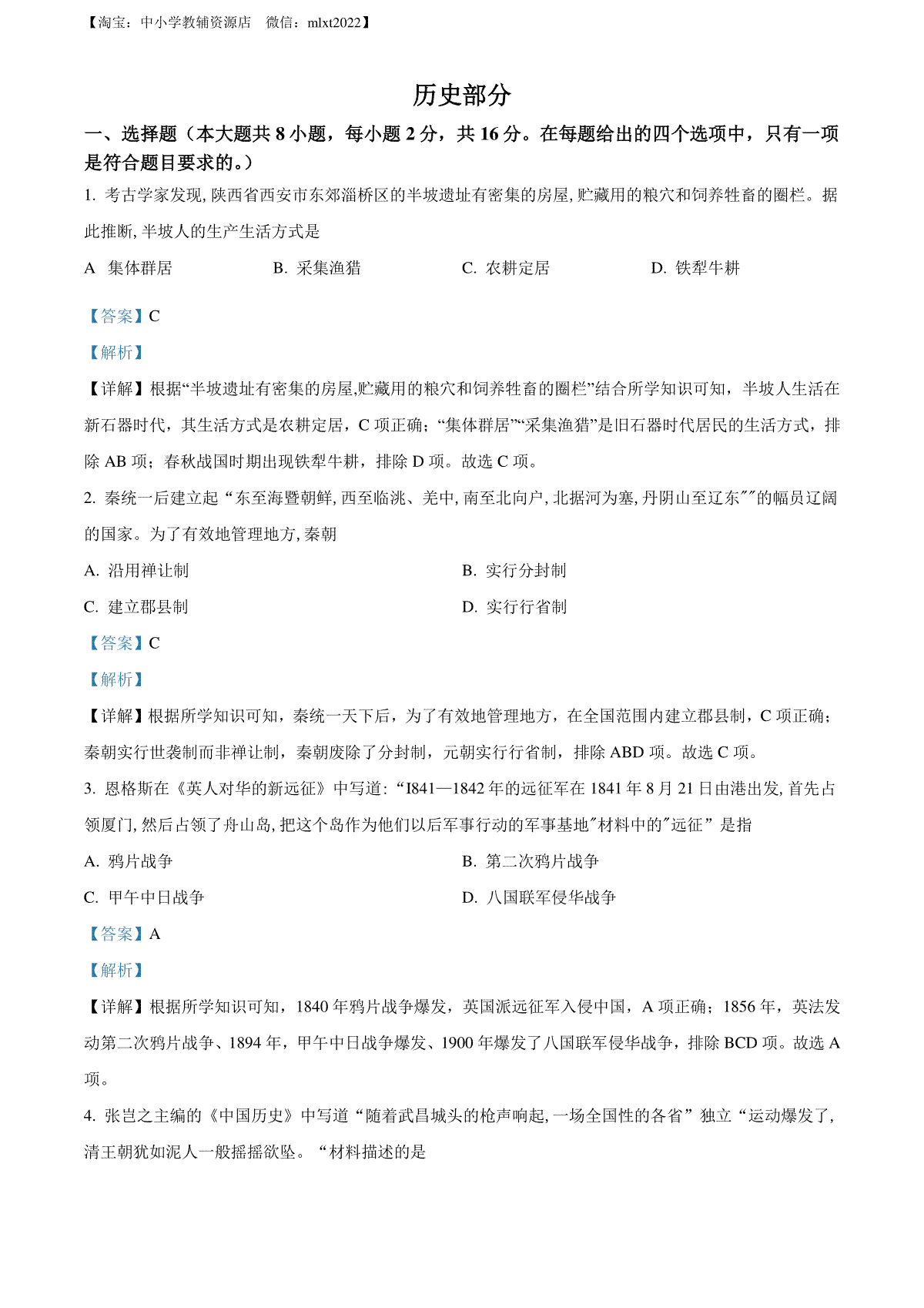 3.精品解析:2022年甘肃省平凉市中考历史真题(解析版)