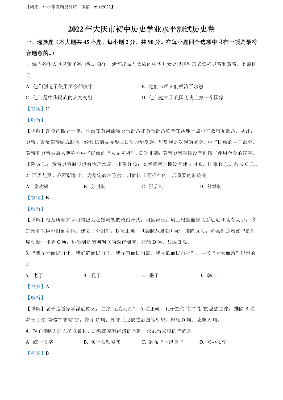 一、精品解析:2022年黑龙江大庆中考历史真题(解析版)