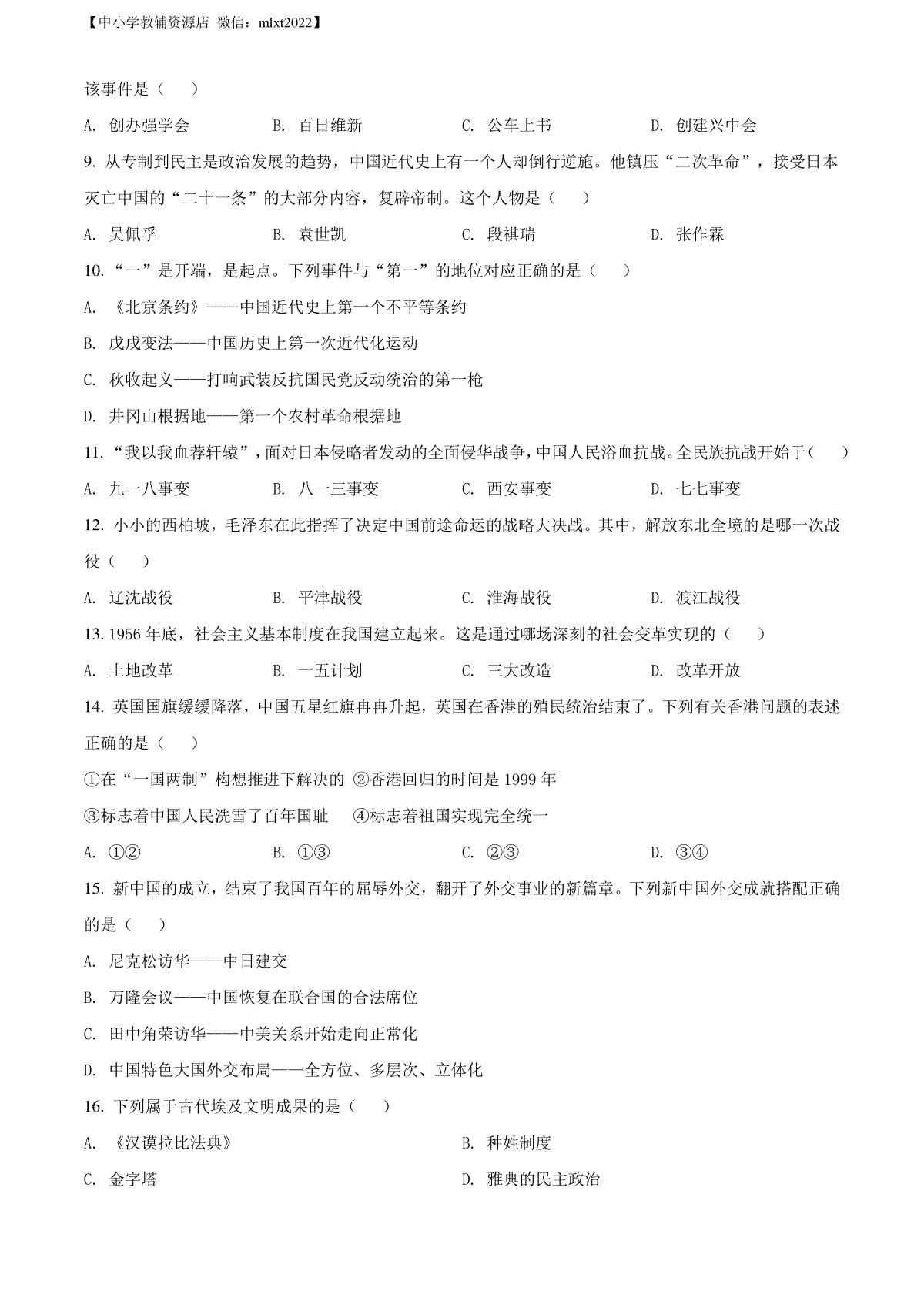 2.精品解析:2022年黑龙江省牡丹江、鸡西地区朝鲜族学校中考历史真题(解析版)