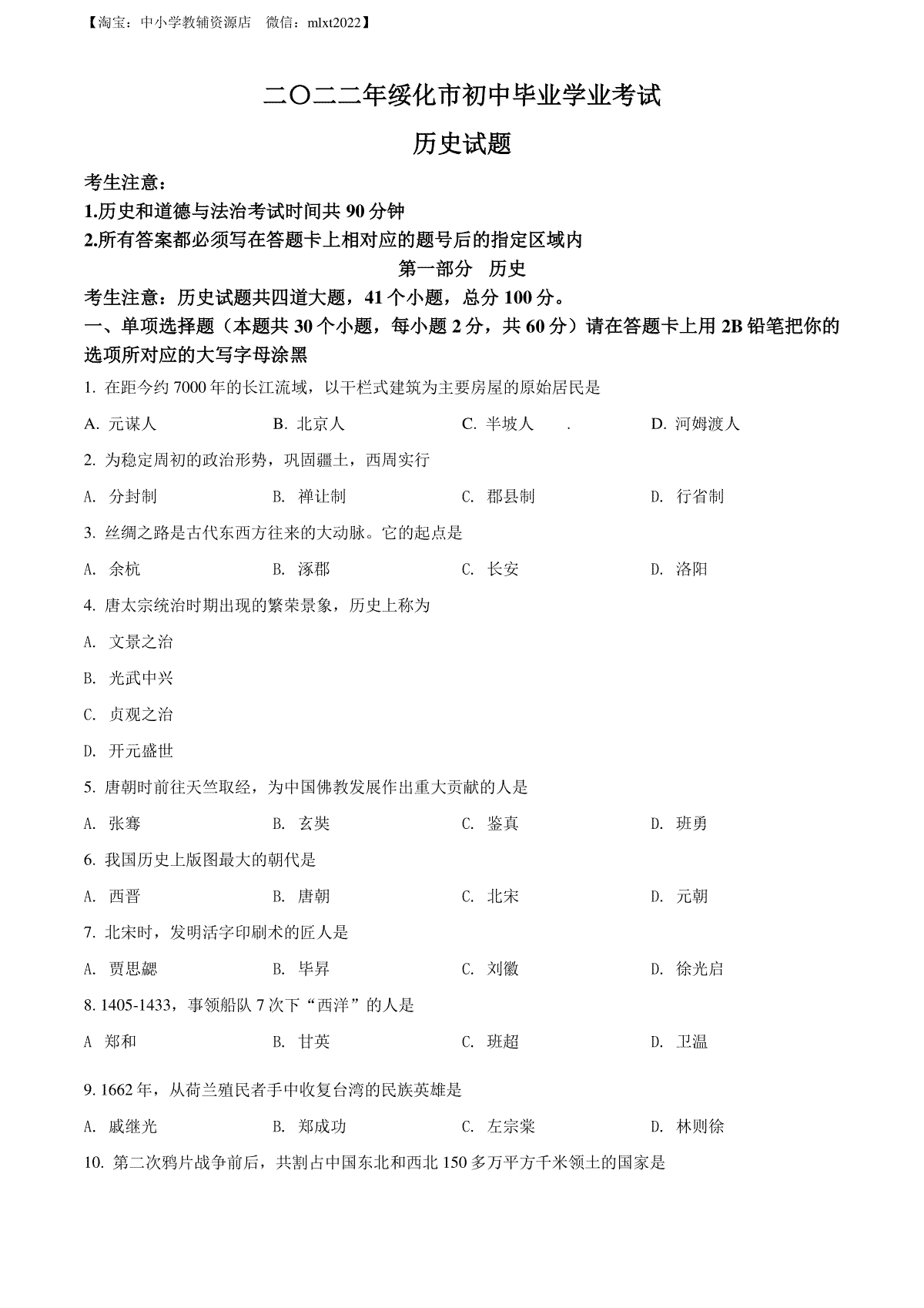 1.精品解析:2022年黑龙江省绥化市中考历史真题(原卷版)