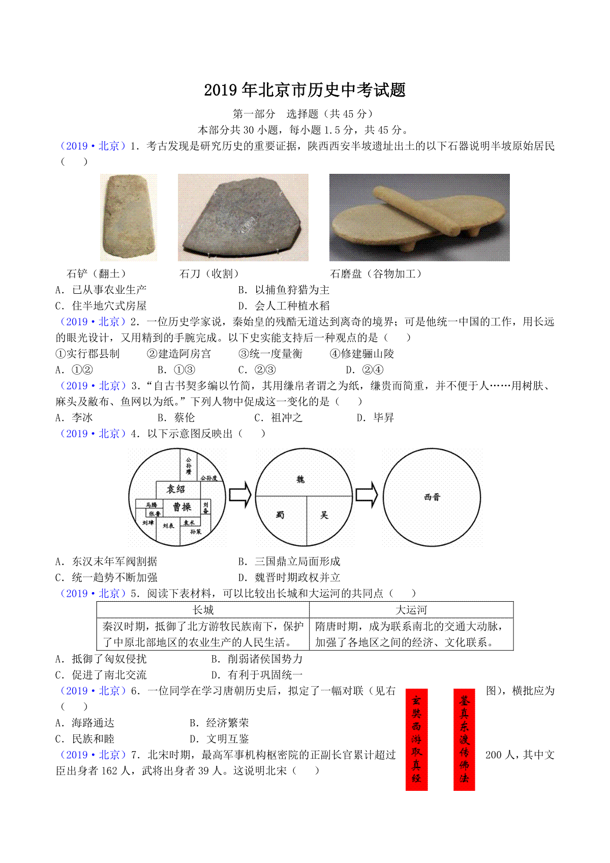 2019年北京市中考历史真题及答案于近期开考,本次考试对考生对知识的掌握参考价值大,为了方便大家复习掌握错题!小编在下文为大家准备了2019年北京市中考历史真题及答案试卷及答案解析详情,仅供考生参考。