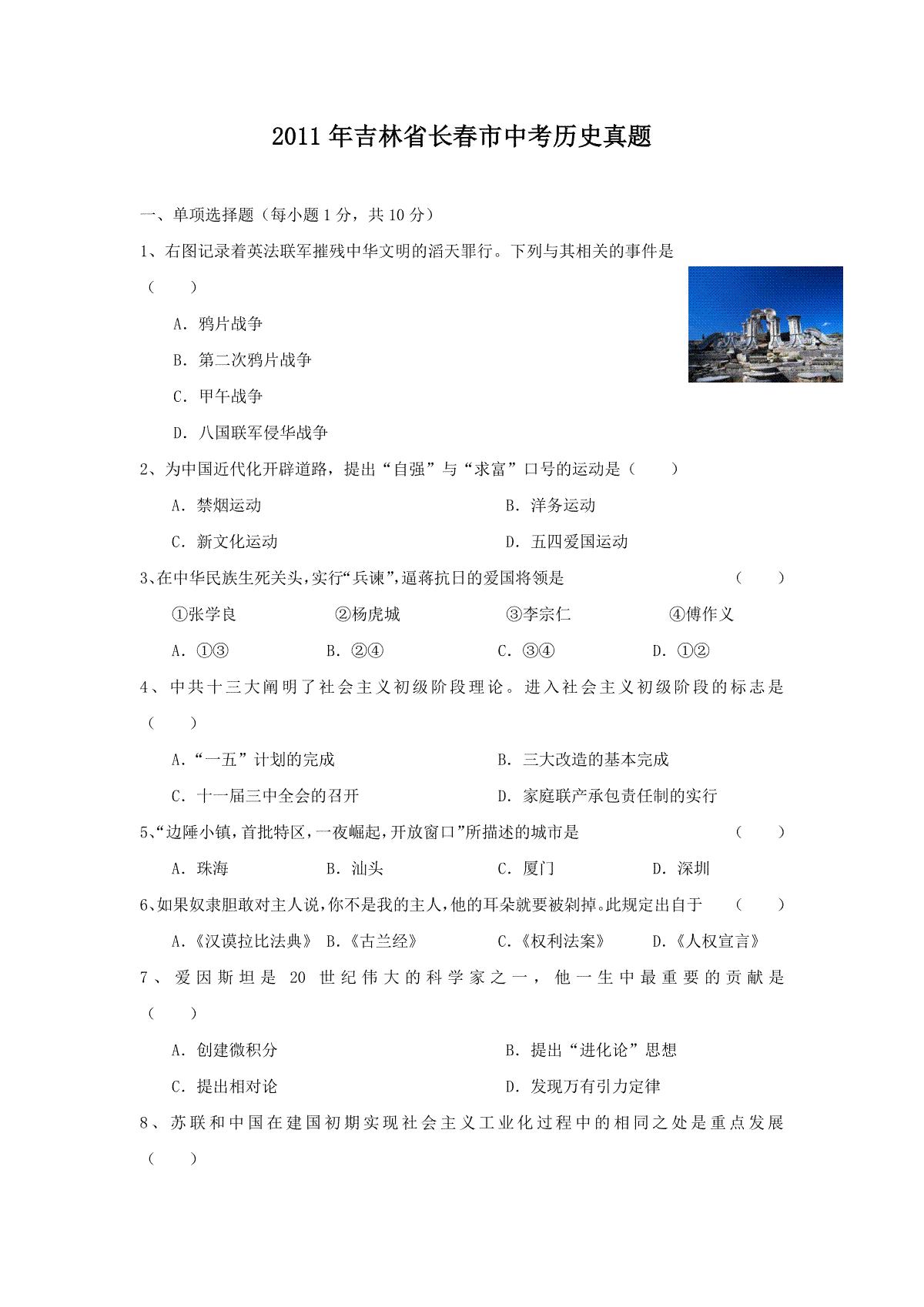 下载2011年吉林省长春市中考历史真题PDF格式或doc