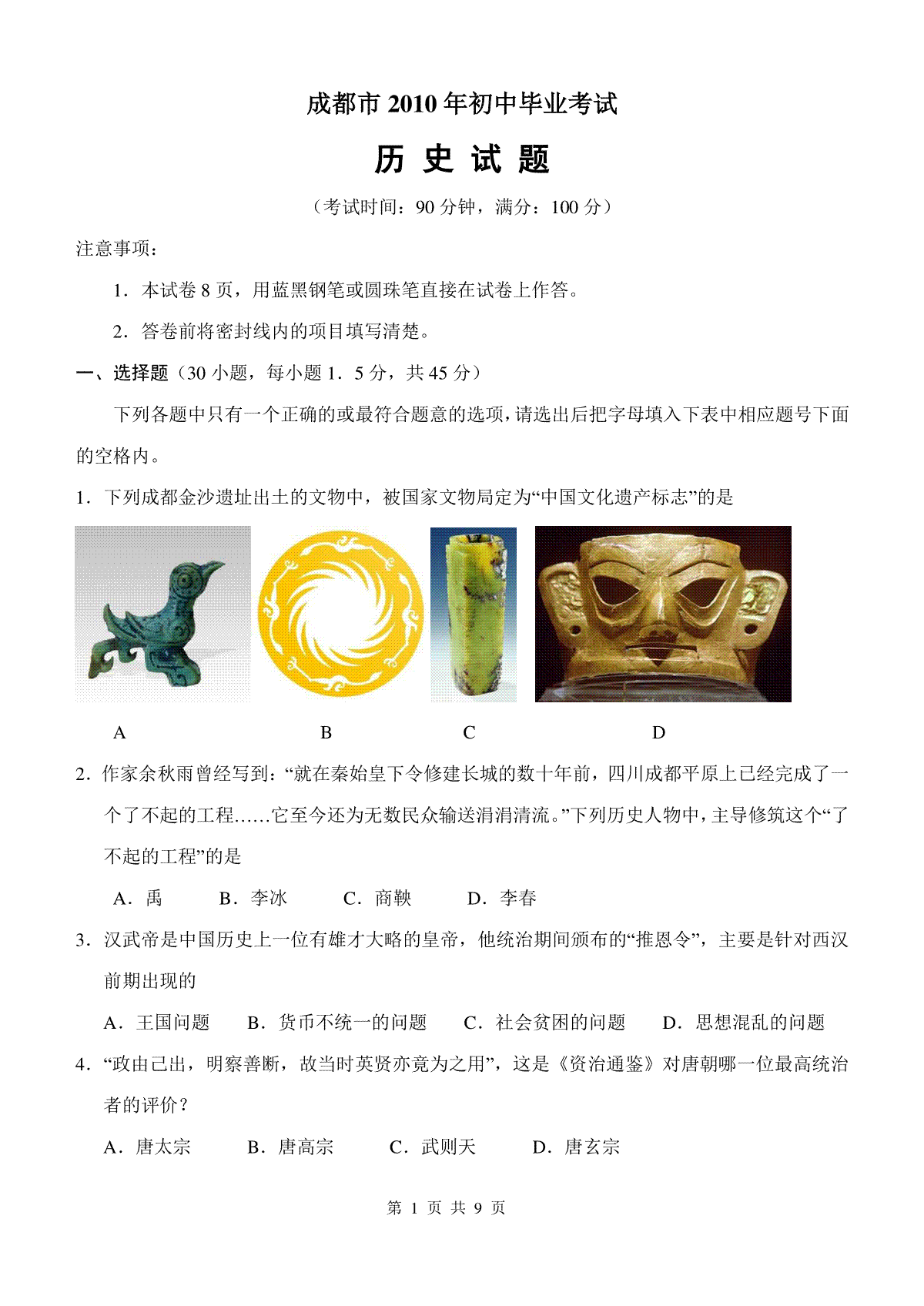 下载四川省成都市2010年中考历史试卷及答案PDF格式或doc