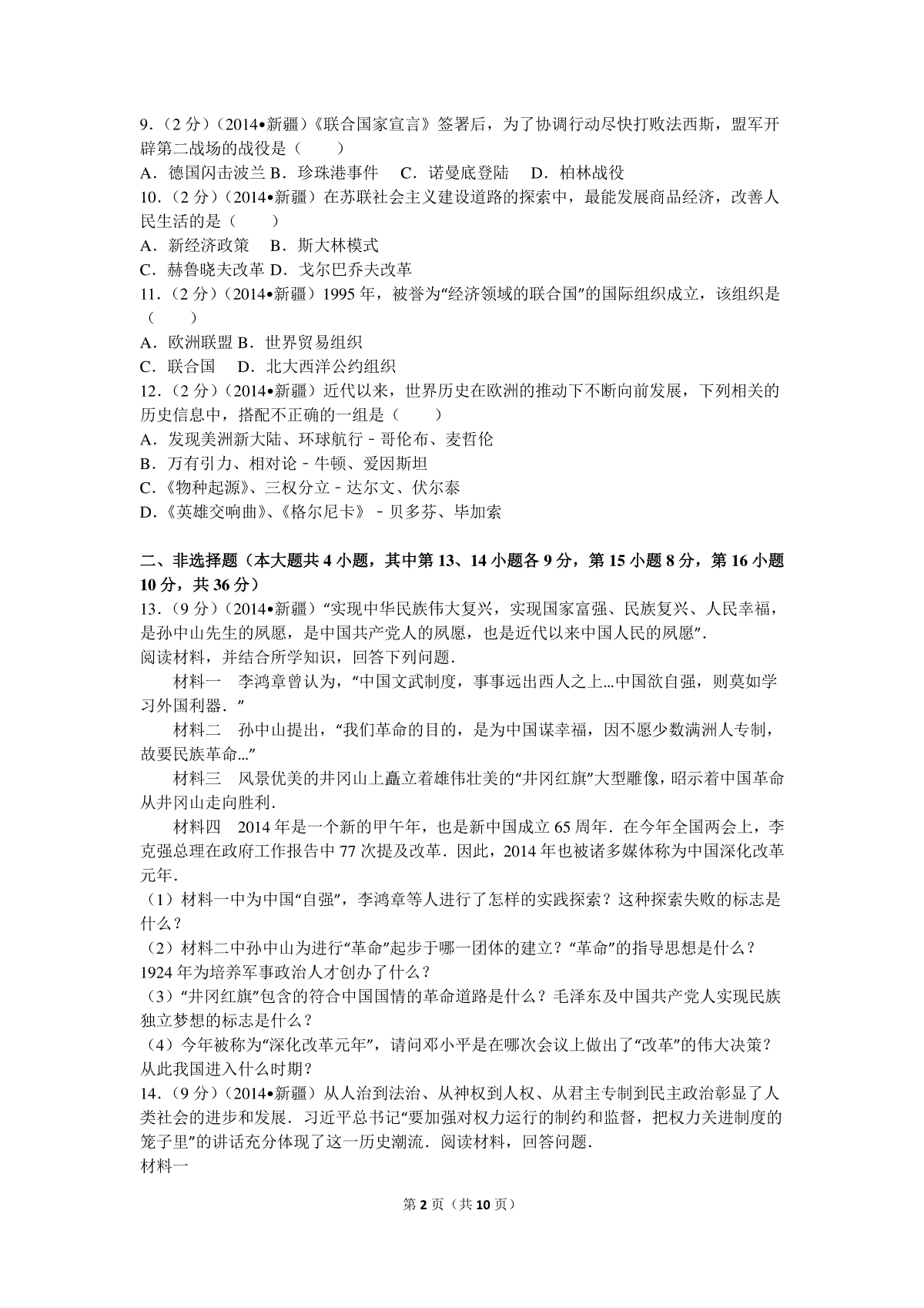一、2014年新疆自治区、生产建设兵团中考历史试卷及解析