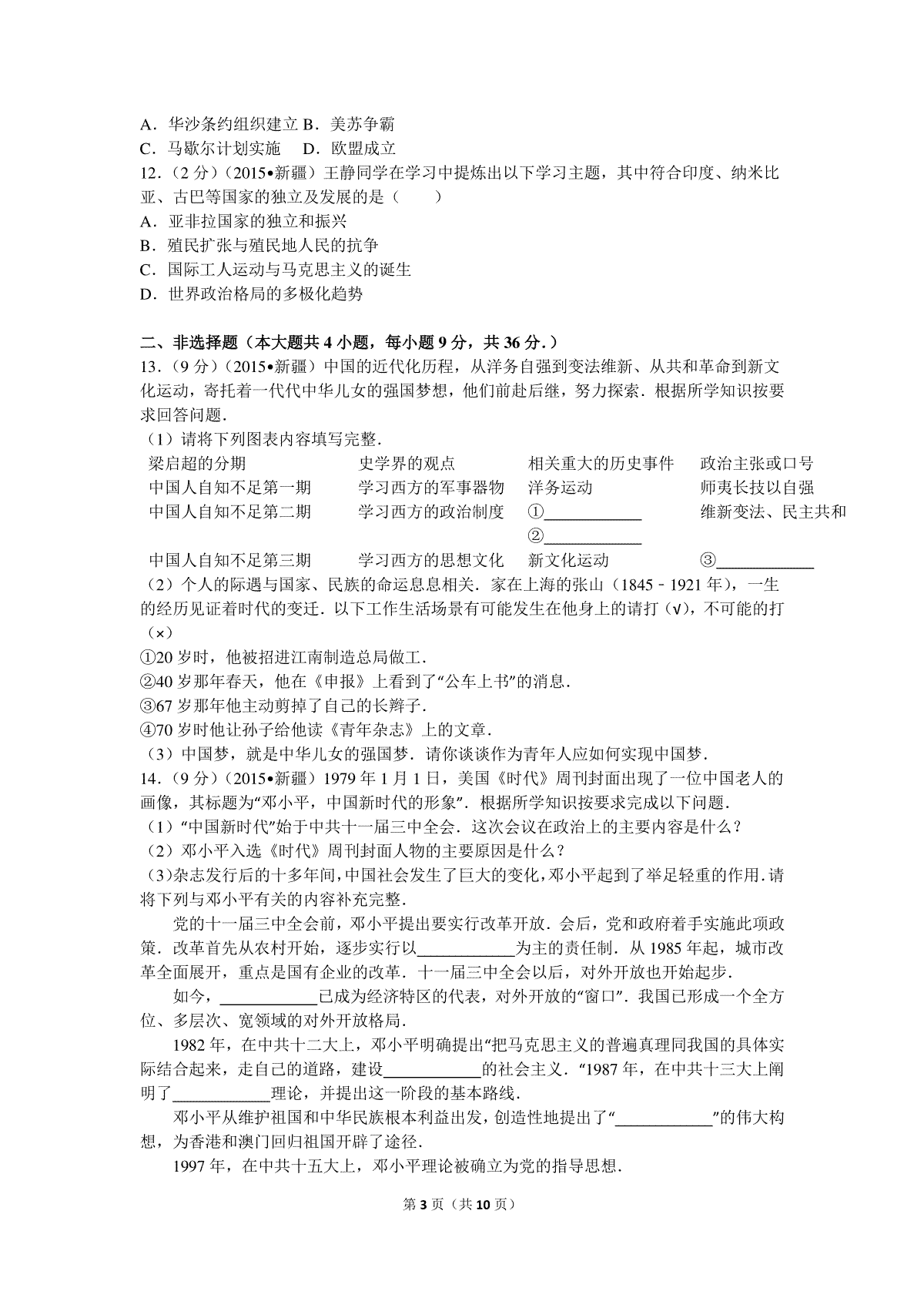 一、2015年新疆自治区、生产建设兵团中考历史试卷及解析