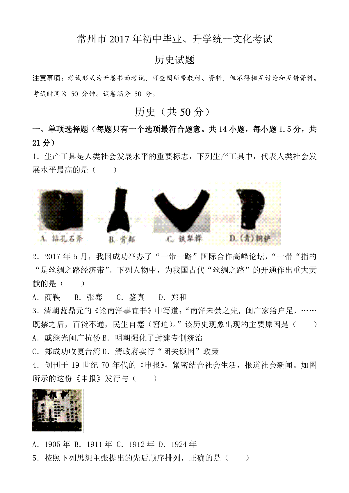 下载2017年江苏省常州市中考历史试卷及答案PDF格式或doc