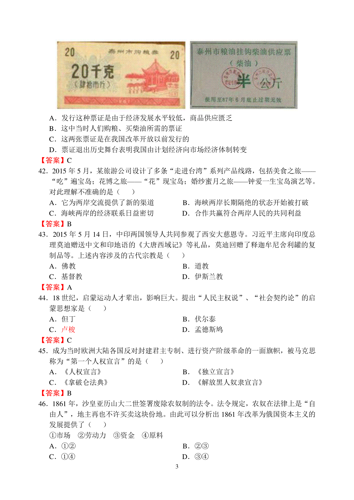 一、2015年江苏省泰州市中考历史试题及参考答案