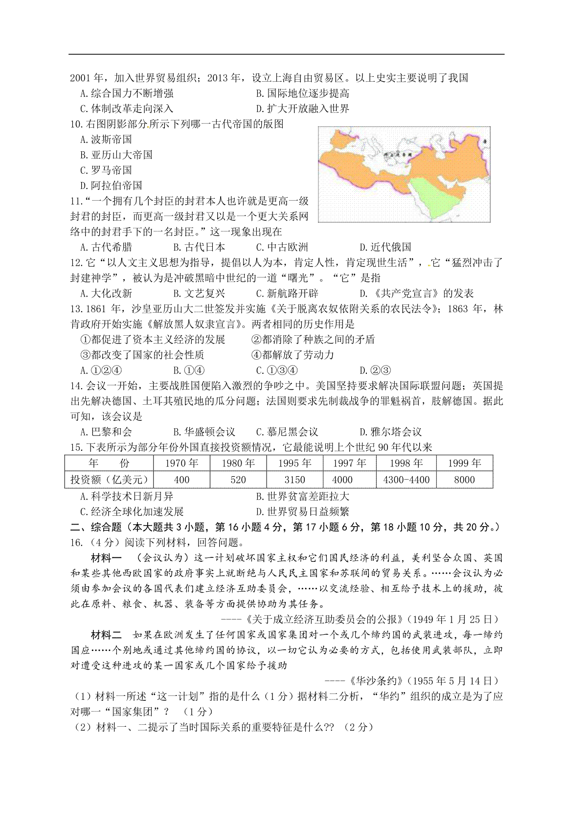 2010年山东省东营市中考历史试题及答案