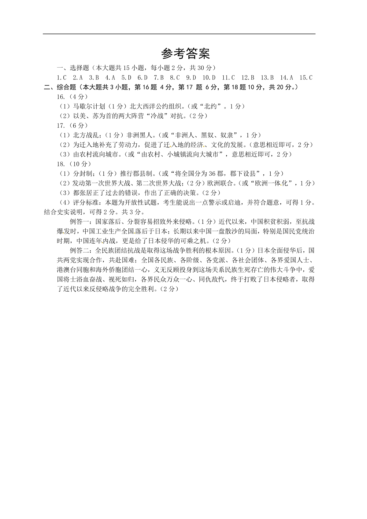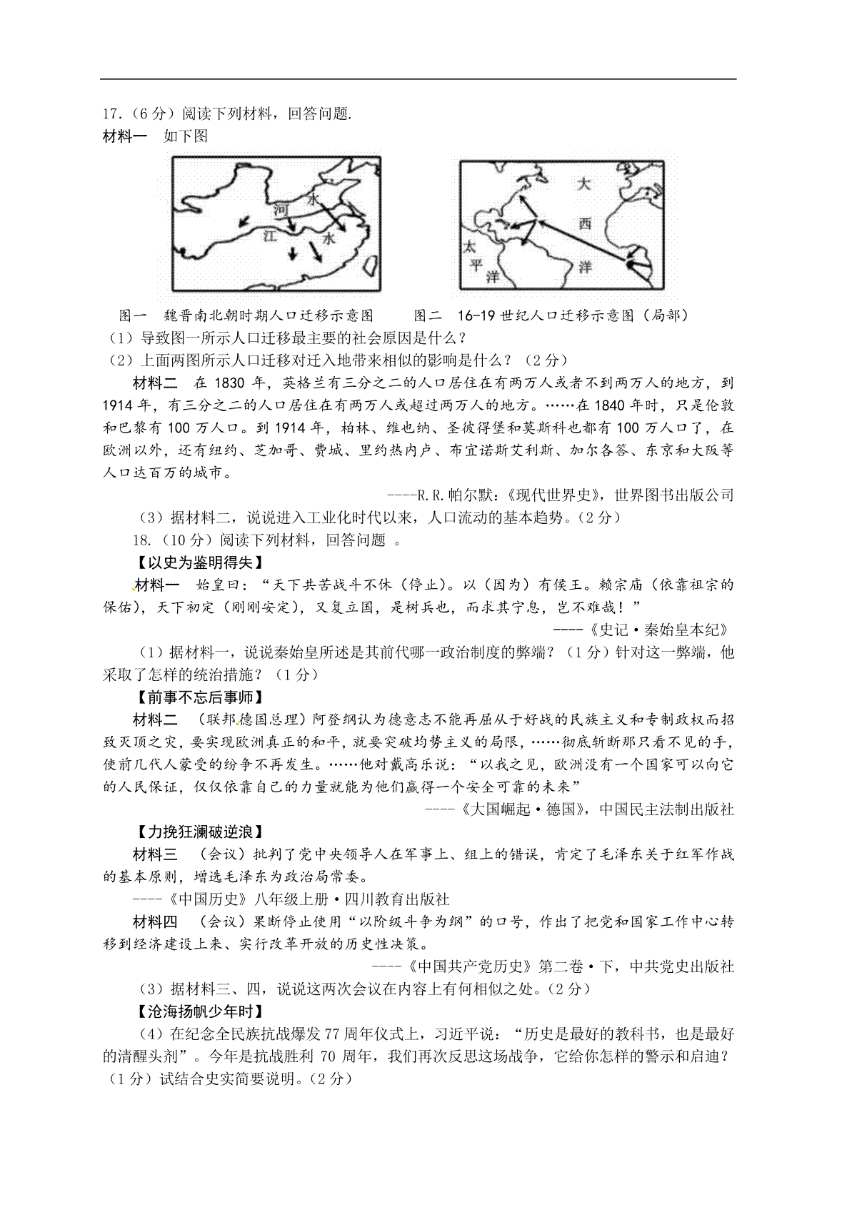 2018年安徽省历史中考试题及答案