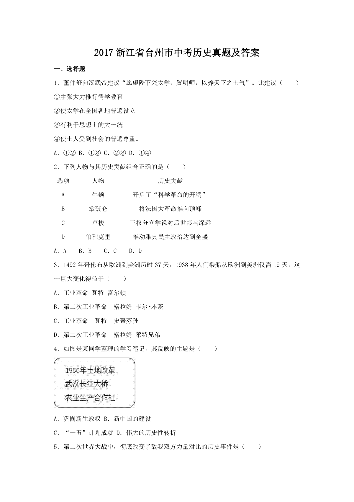如果你想下载2017浙江省台州市中考历史真题及答案DOC或PDF版,请点击本文末链接!
