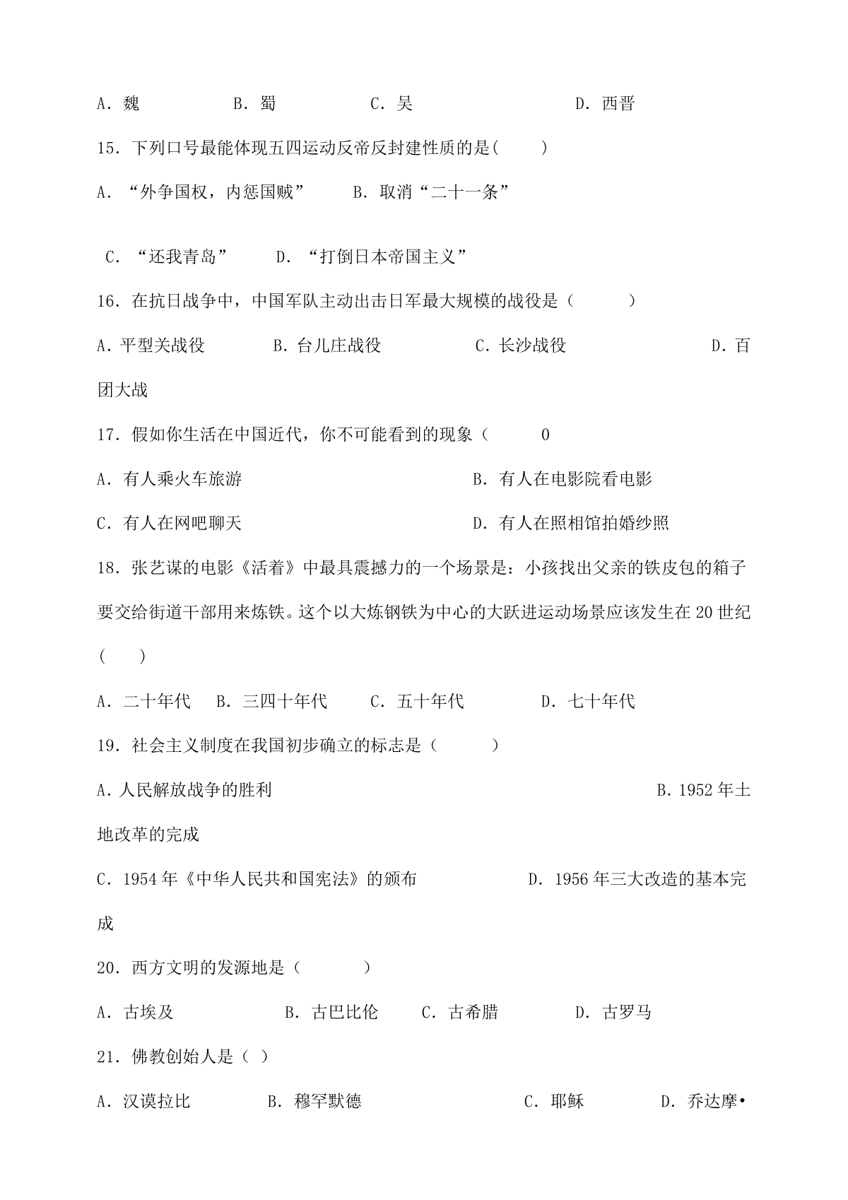 3.精品解析:2021年湖南省衡阳市中考历史试题(原卷版)