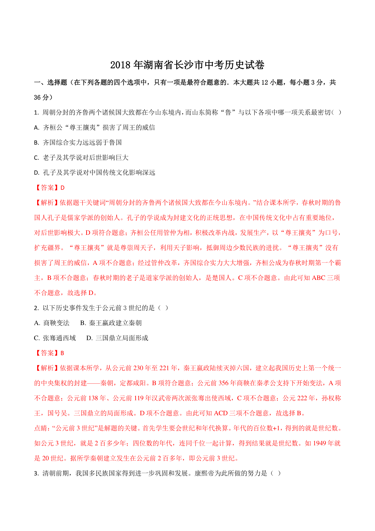 一、2018年长沙市-中考-历史试题及答案