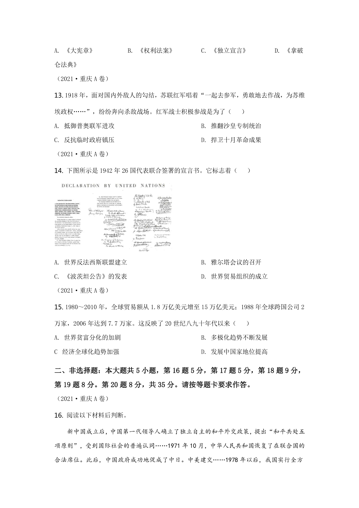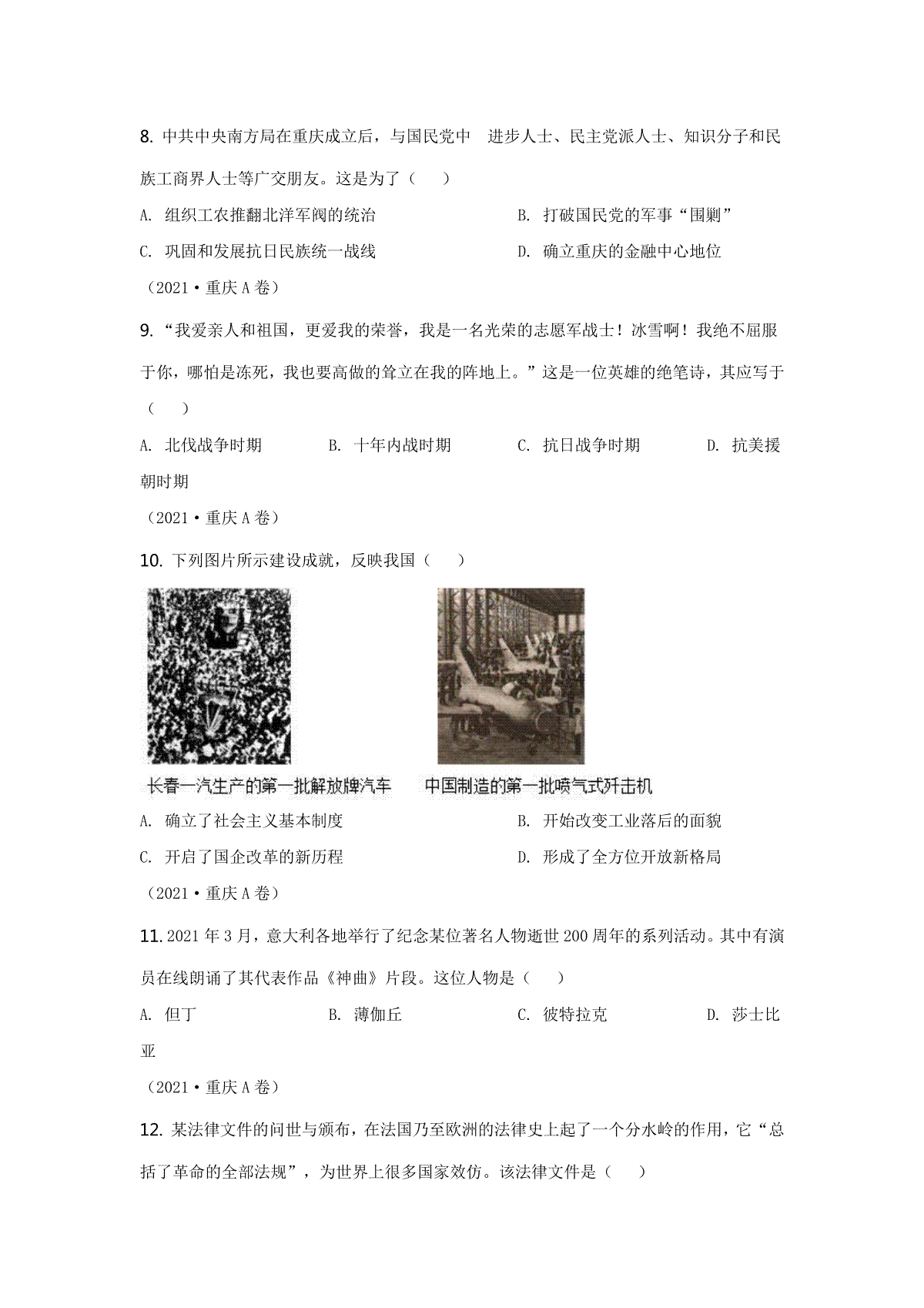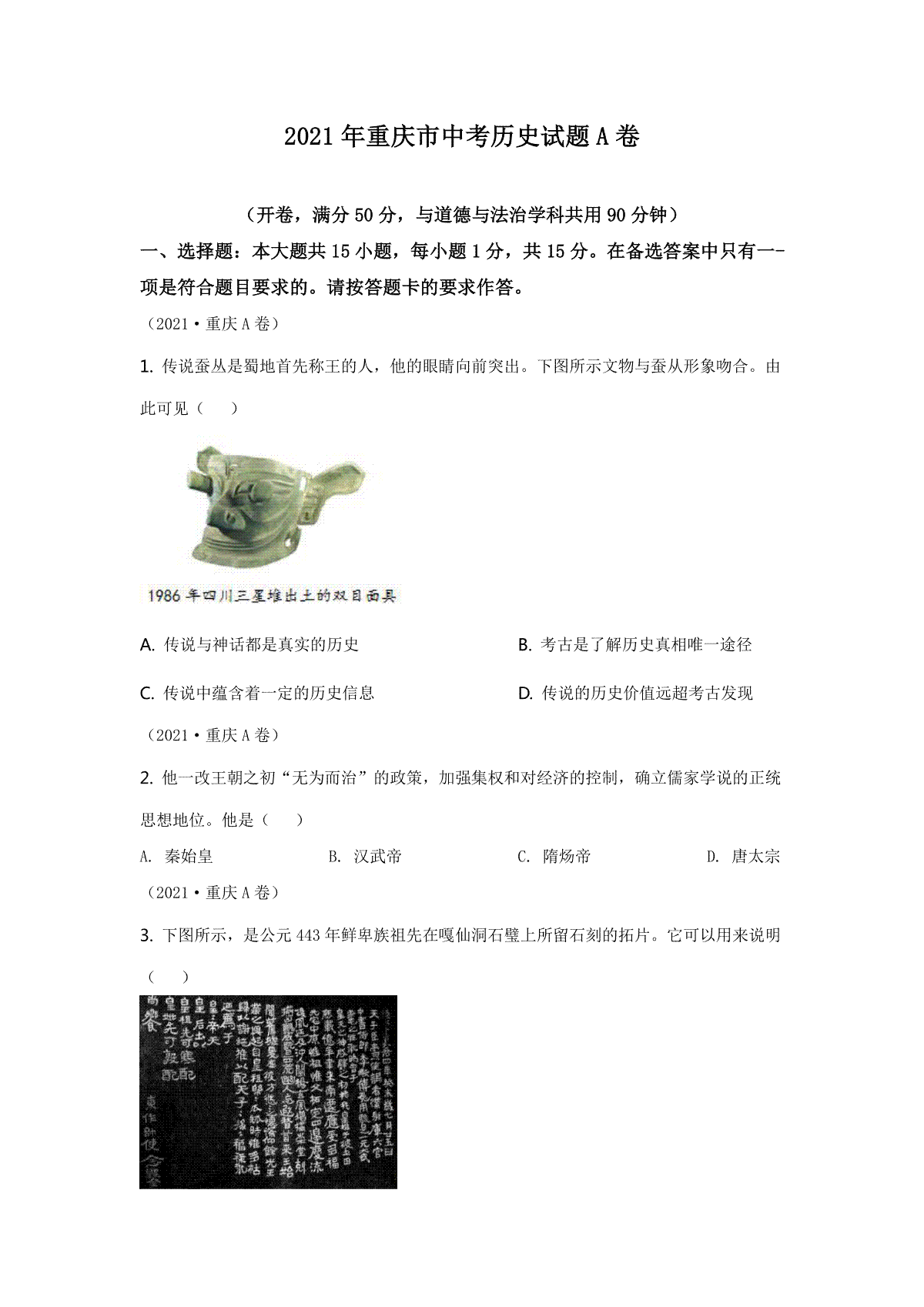 1.2021年重庆市中考历史A卷试卷(含答案)